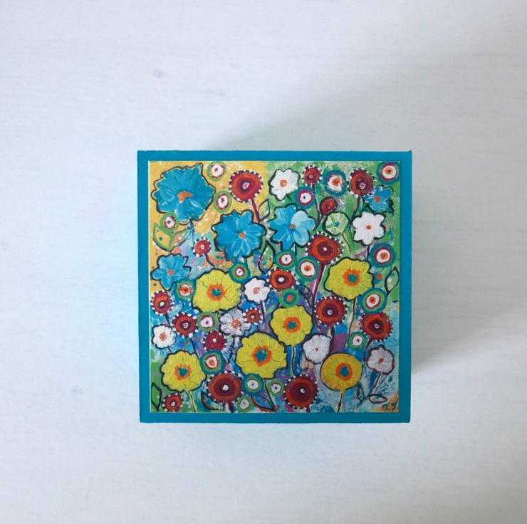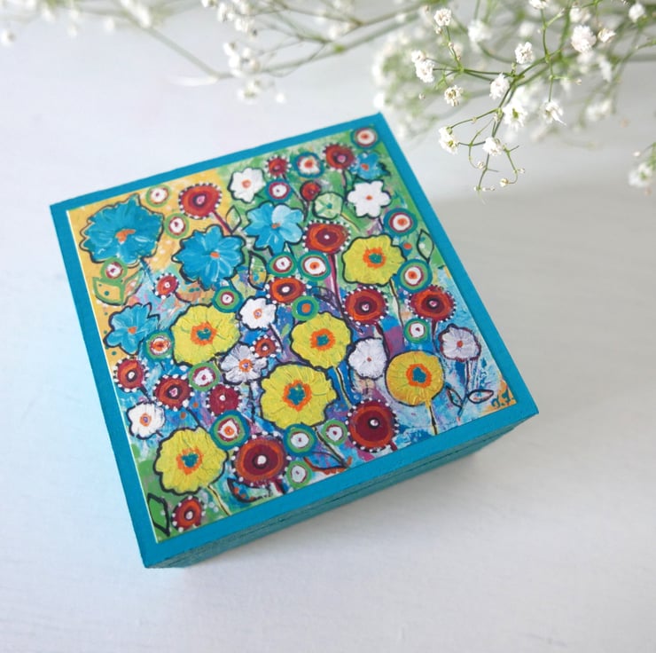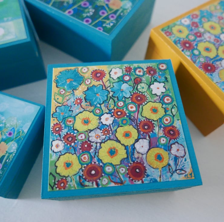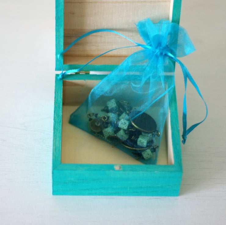 This pretty gift box is handpainted by me in acrylic turquoise on plywood and then I have mounted an art print after one of my original paintings on the lead. These jewellery storage boxes are very popular as gifts for girls of all ages and they look great as part of your home decor, in your craft room or girls' room.