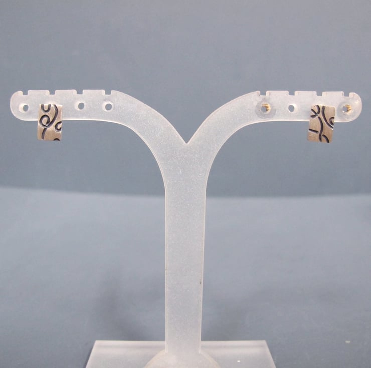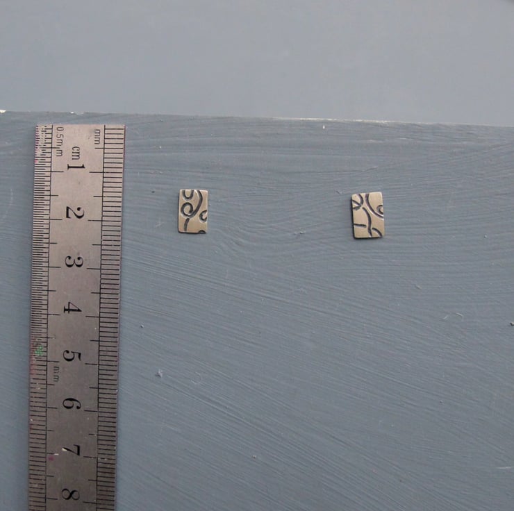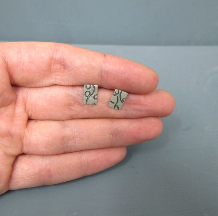 Handmade rectangle sterling silver earrings featuring embossed doodle drawing lines which have been oxidised black to create a strong contrast with the satin bushed finished silver. Simple little earrings perfect to wear everyday.