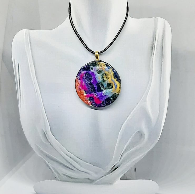 Abstract pendant necklace featuring an eye catching powder art design. Handcrafted from polymer clay, each piece of polymer jewellery is a wonderful random creation of colours.