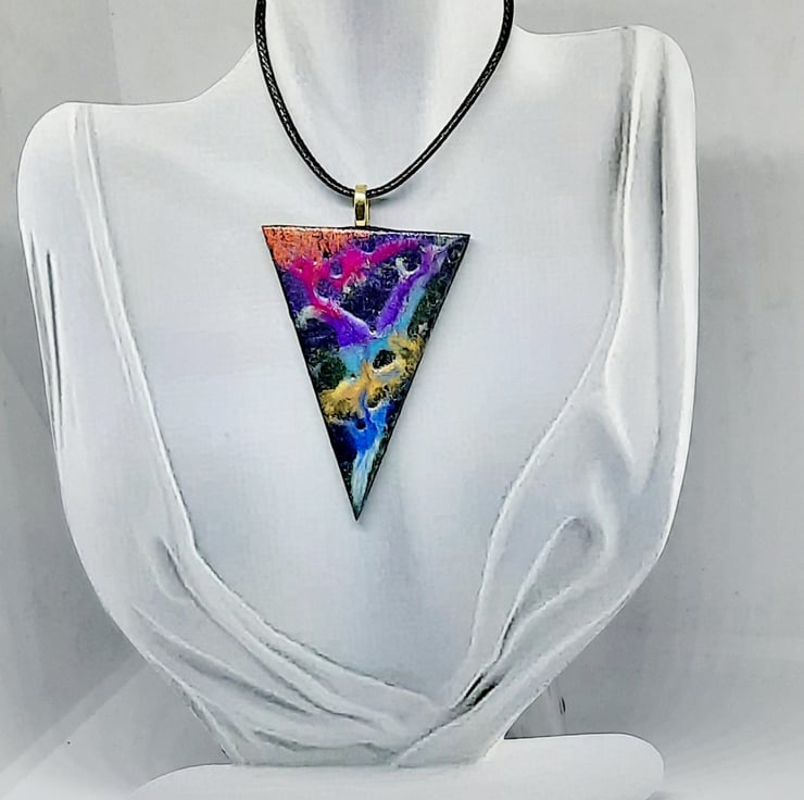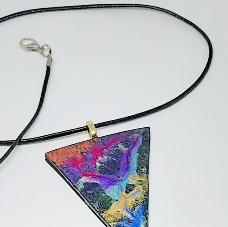 Abstract pendant necklace featuring an eye catching powder art design. Handcrafted from polymer clay, each piece of polymer jewellery is a wonderful random creation of colours.