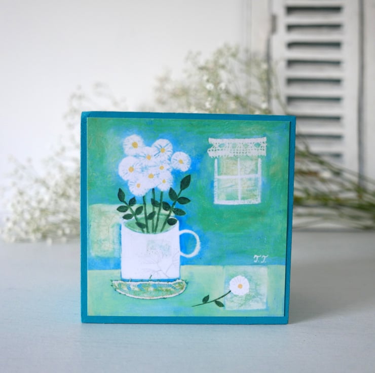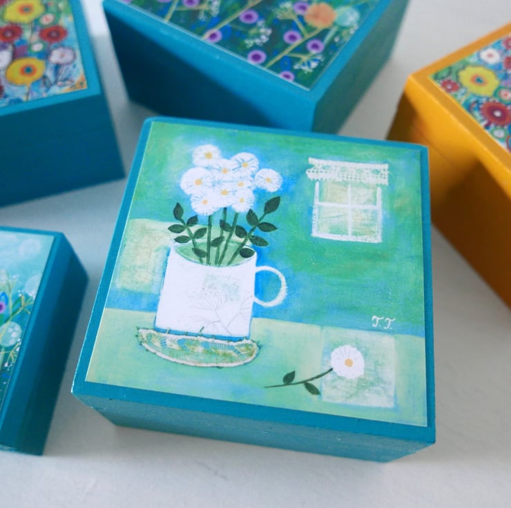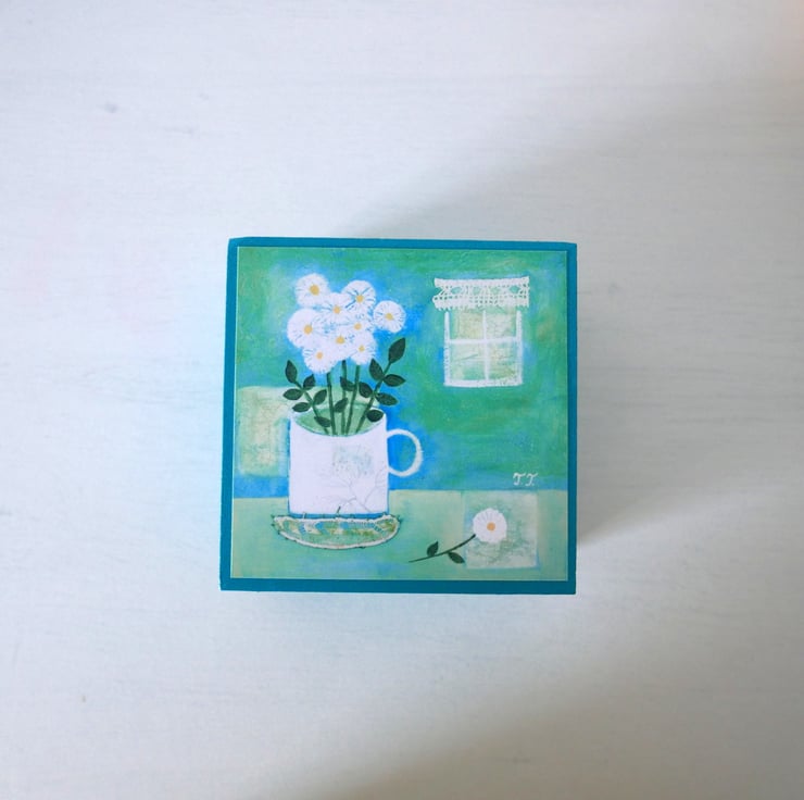 This turquoise jewellery box is hand-painted by me with acrylic paint and it features a still life art print after one of my original paintings titled "White Flowers in a Vintage Mug". The box is perfect for small items or as a decorative box in your home. It measures 4.3" x 4.3" x 2.4" high and it is varnished for protection.