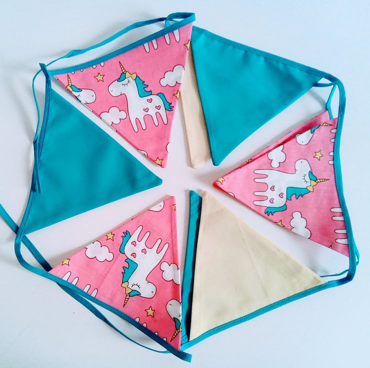 The flags have a pink background with a unicorn on 4 flags which are all double sided and there are 4 blue flags and 2 lemon flags, you can hang either way.