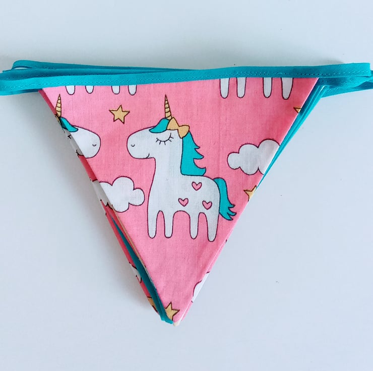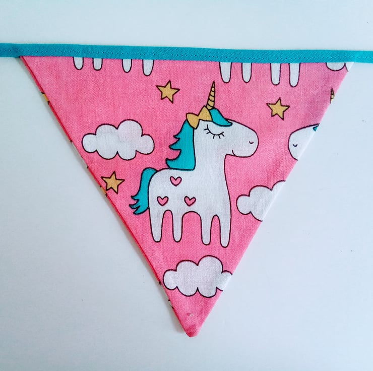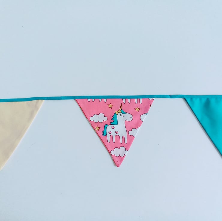 The Unicorn flags are made from cotton poplin and the plain flags are made from polycotton with a blue polycotton binding.