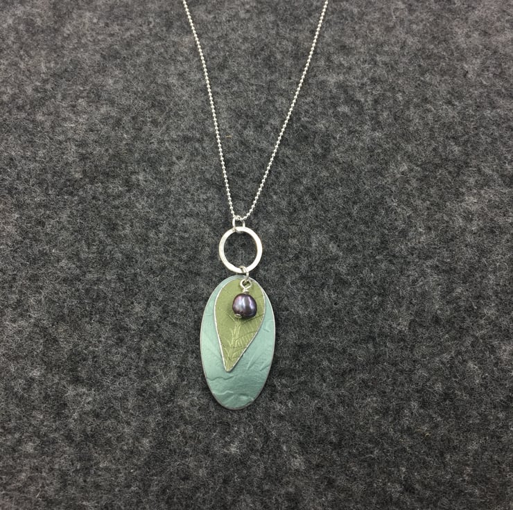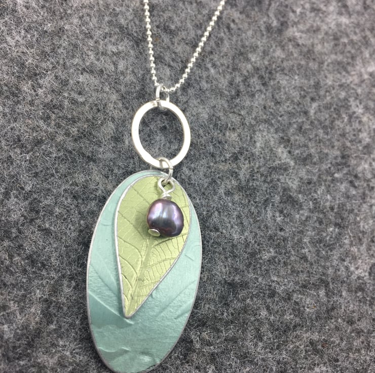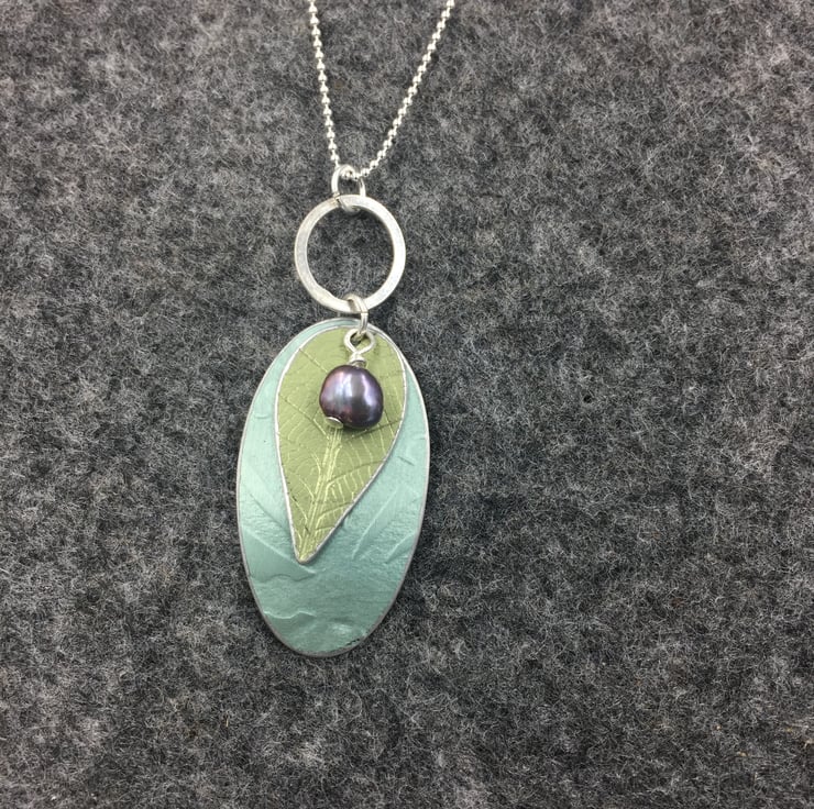 The oval, leaf and freshwater pearl hang from a sterling silver ring. The sterling silver ball chain is 18” long and the pendant part is approx 4.5cm in length.