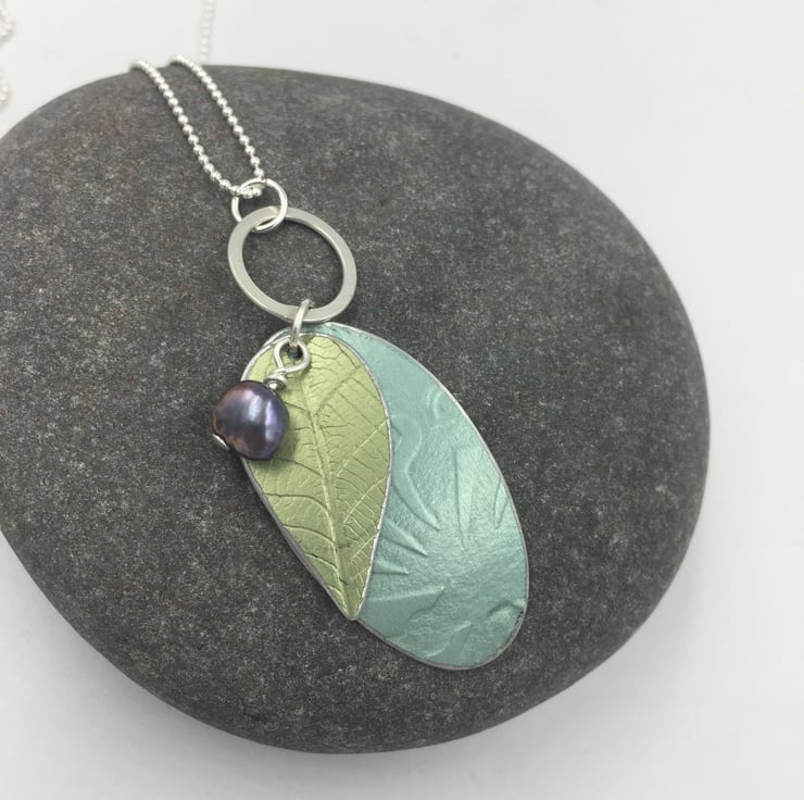 From my ‘Abundance’ range, this pretty layered pendant is made from textured and dyed anodised aluminium in shades of pale teal and green.