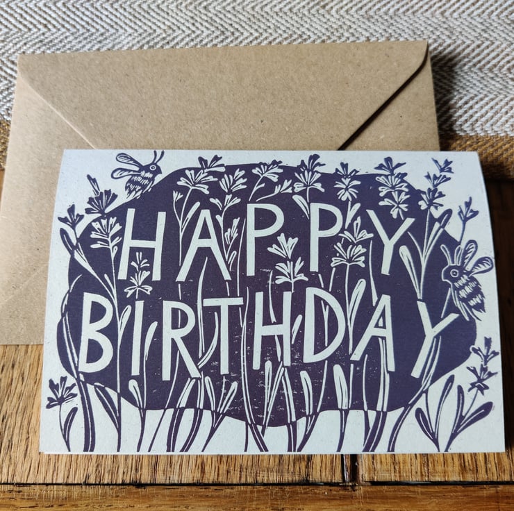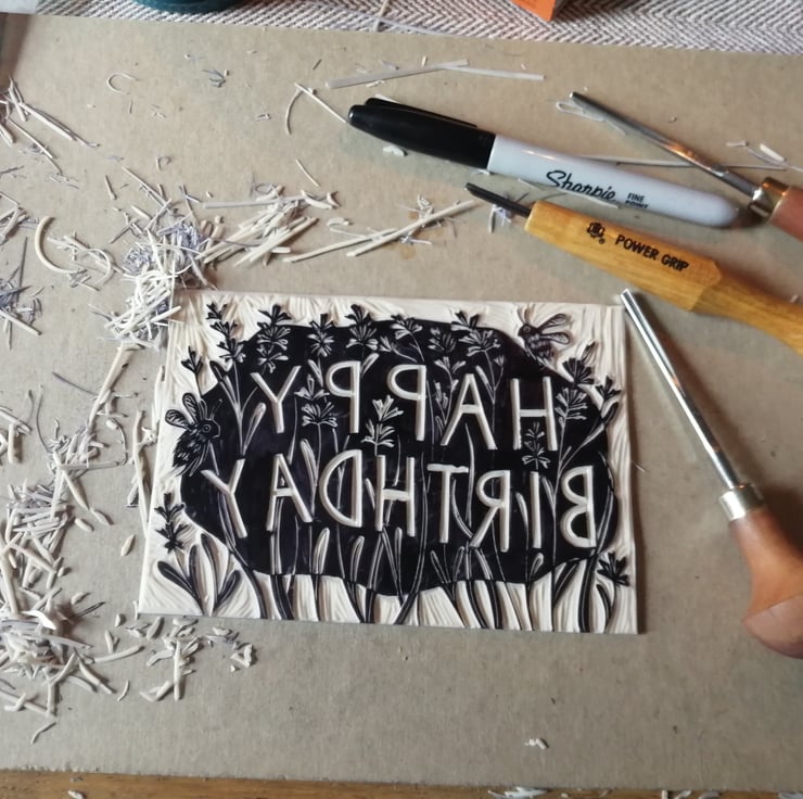 I love drawing and carving botanical designs so wanted to print a birthday card based on lavender and bees!