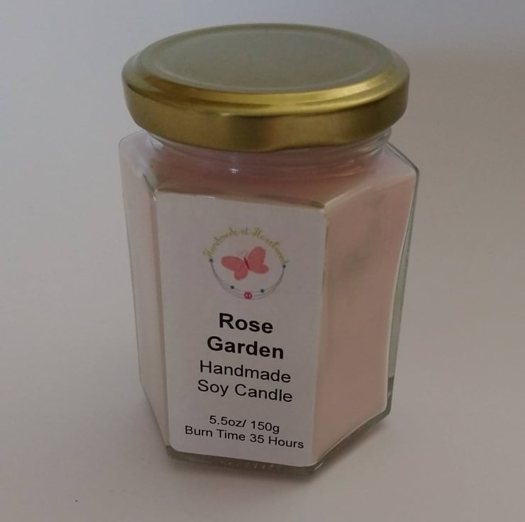 This is a Soy Wax candle scented with rose garden fragrance oil and has a pale pink colour.