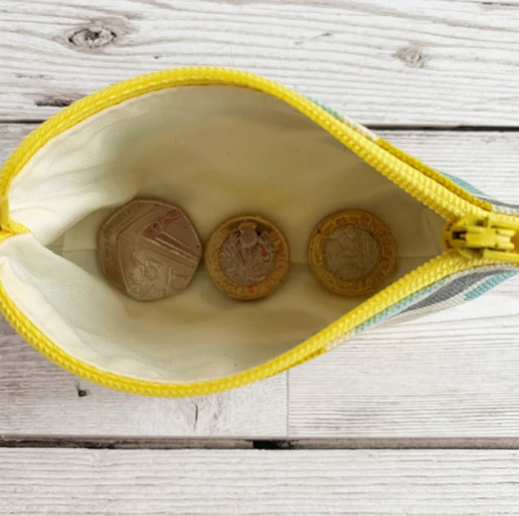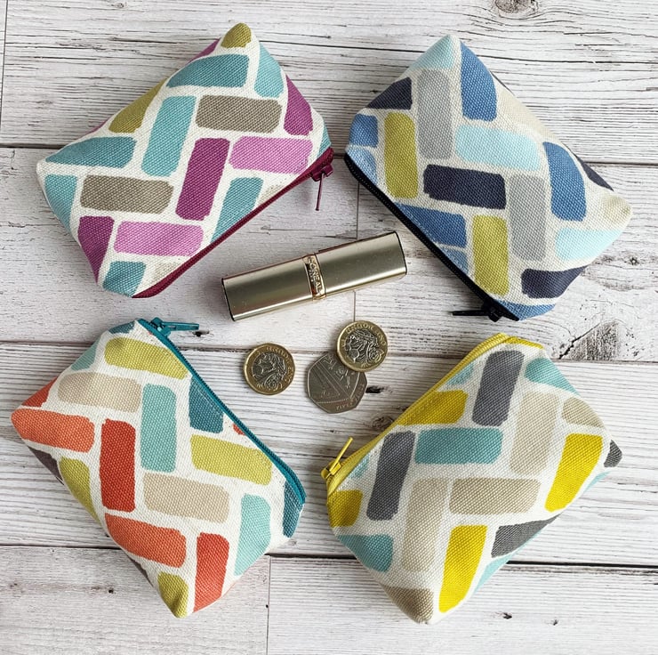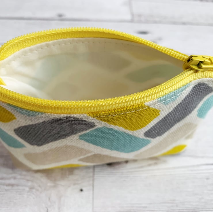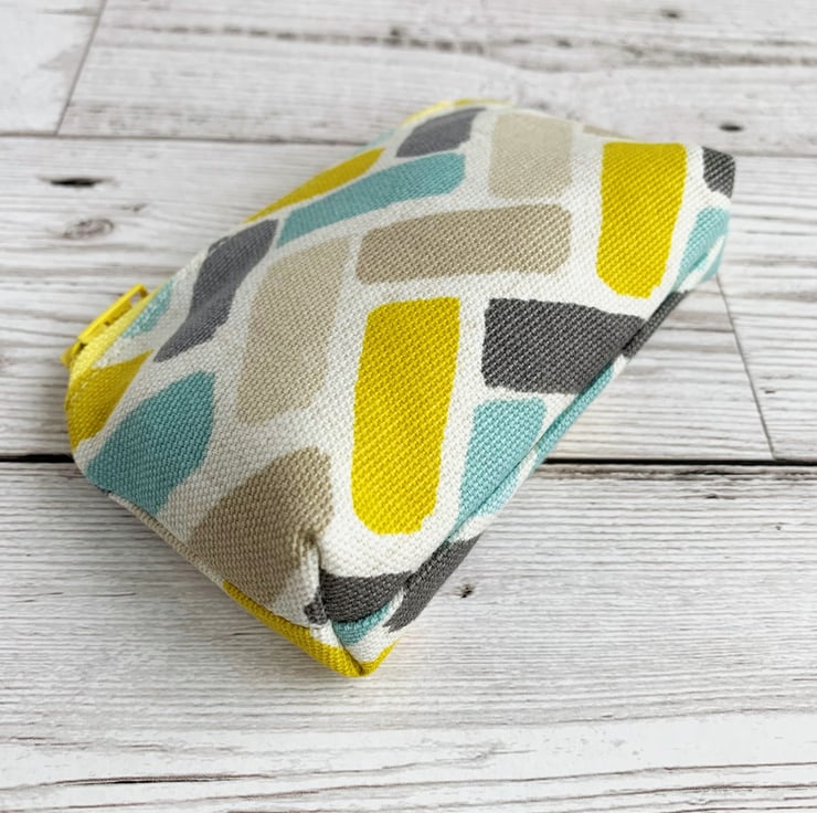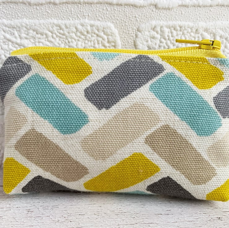 A small coin purse with a turquoise, yellow and beige herringbone pattern. This brightly coloured little purse is made from lovely print fabric in ivory with a pattern of rectangular blocks in a loosely constructed herringbone layout. The blocks are depicted in shades of turquoise, yellow, beige and grey. The coin purse has a matching yellow zip and is lined with cream fabric. The base of the purse is boxed to give extra space inside.