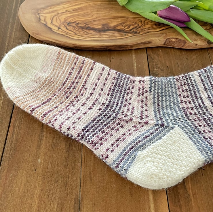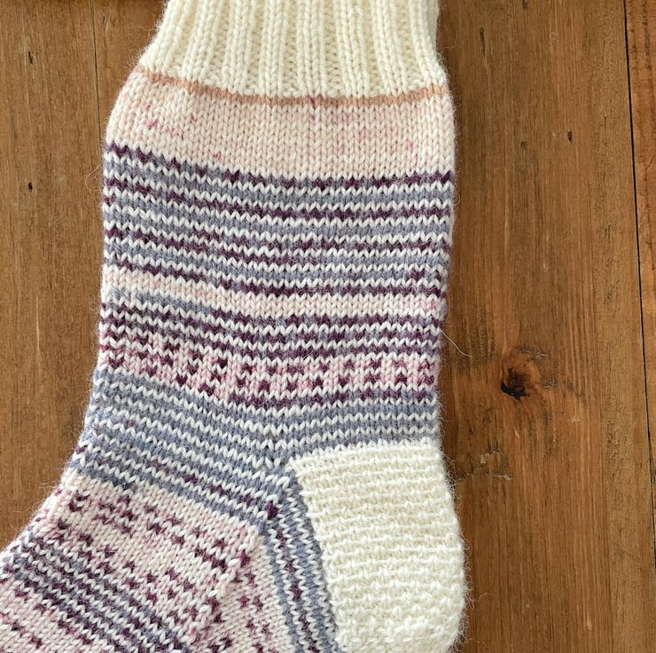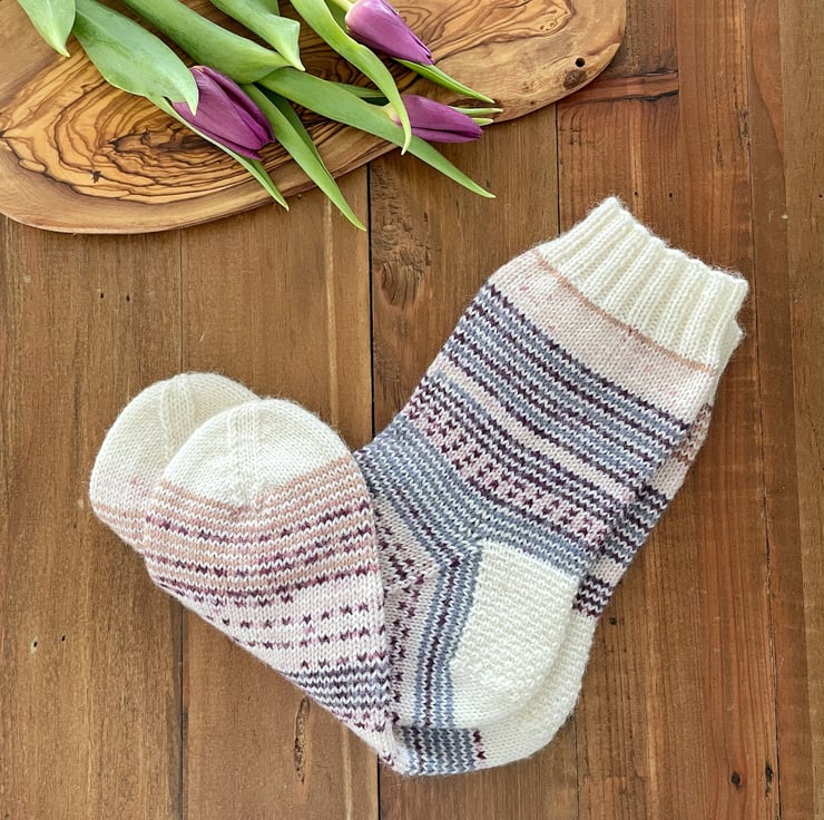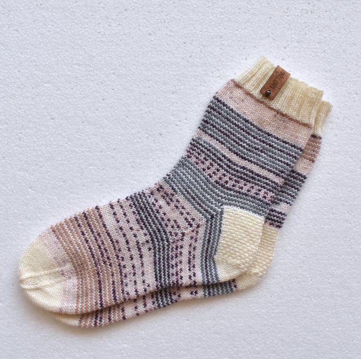 Soft socks in a beautiful colour combination of purple, off white, beige and denim blue will keep you warm and cozy, or can make a great gift for someone special.