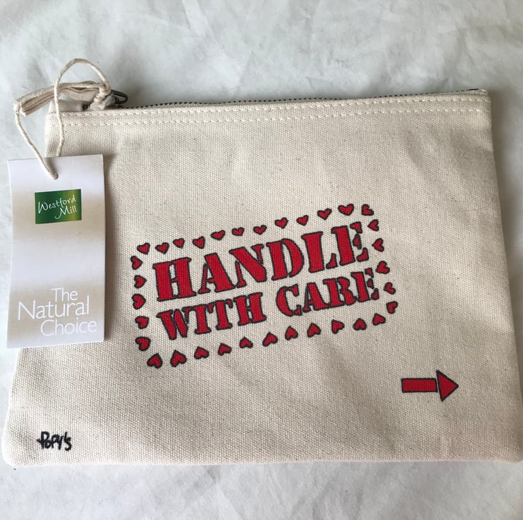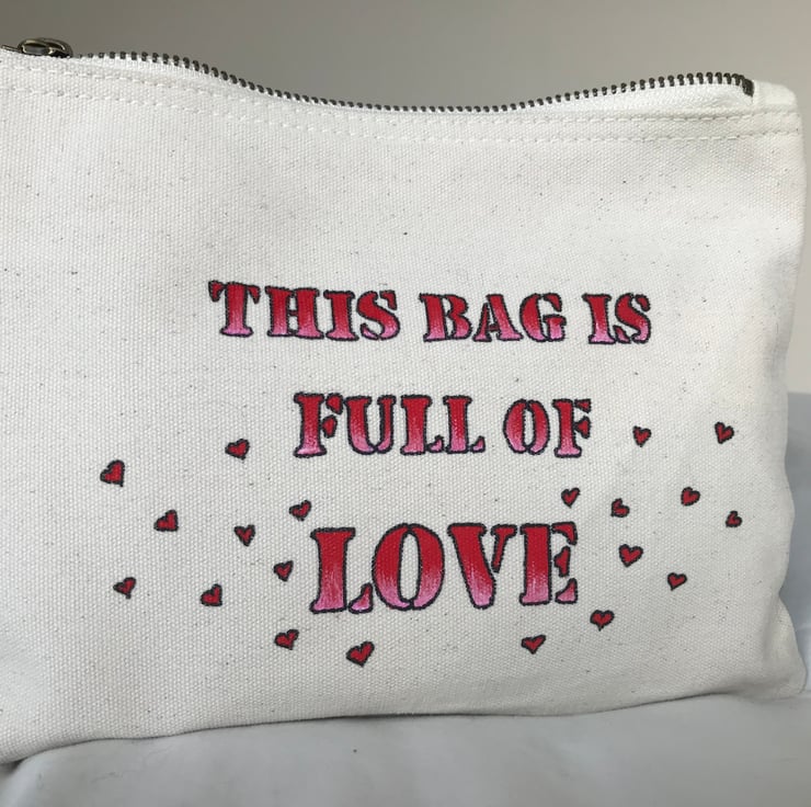 The bag features at the front the writing “handle with care” in red, and at the back “this bag is full of love” in red and pink characters. Small hearts have been drawn both at the front and back.