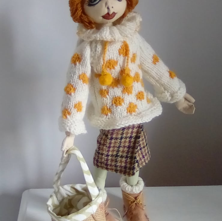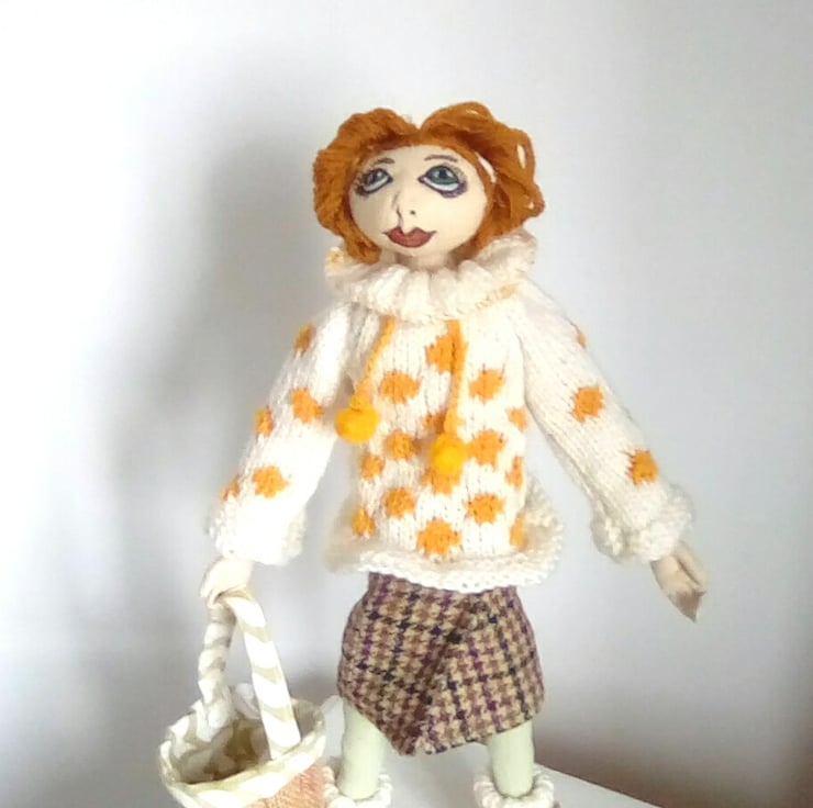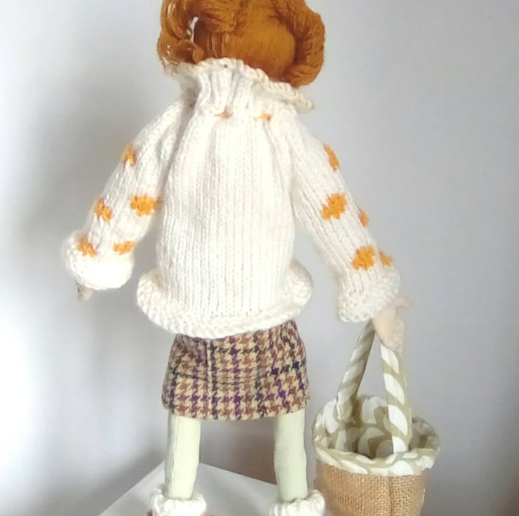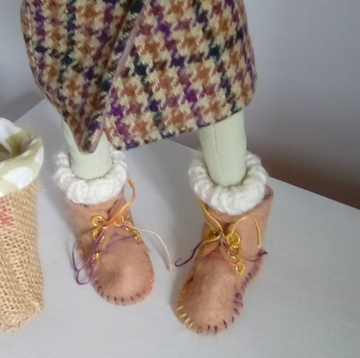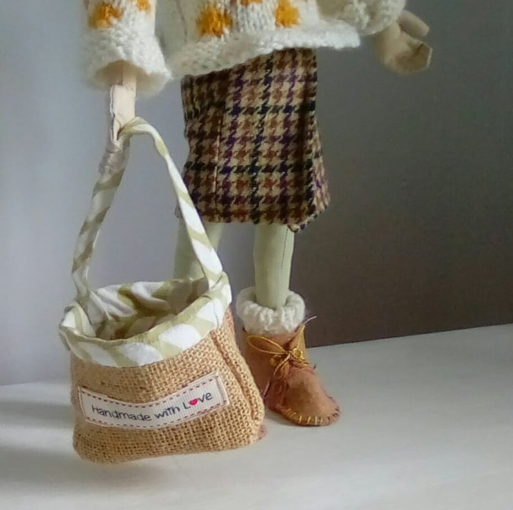 I have made Pippa from cotton fabric, she has some metal in her legs to help her stand and is stuffed with compliant stuffing. I have hand painted her features and she has wool hair. Her skirt is made of Tweed fabric and her jumper is of polyester wool. Her boots are of wool felt and she has wool leg warmers. Her bag is of hessian which I have lined with cotton fabric.