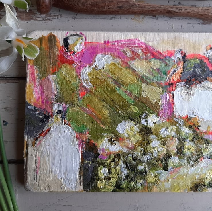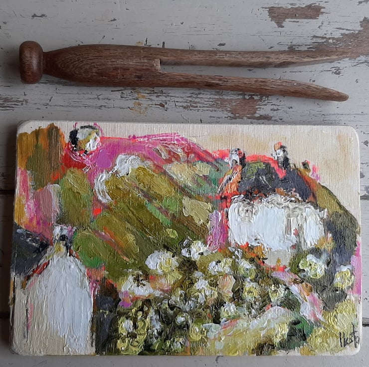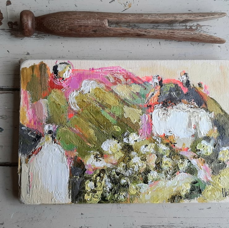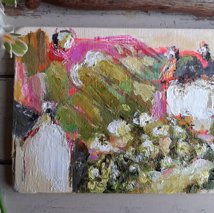A small sweet painting. With pops of pink from the under painting showing through. Semi abstract primroses. Painted on reclaimed wood by artist Hesta Singlewood ,measuring just 12 cm in length .ready to hang .