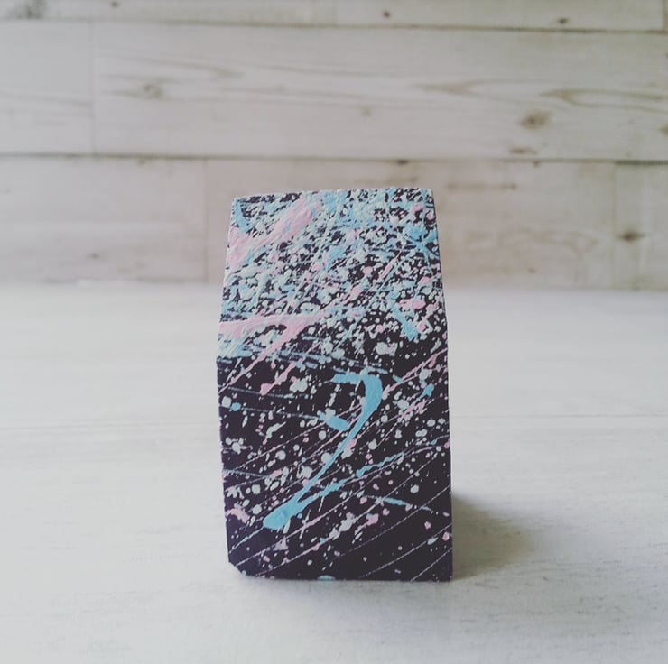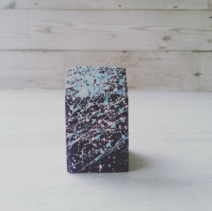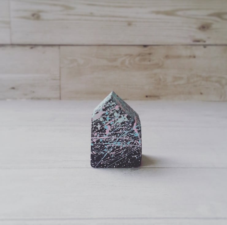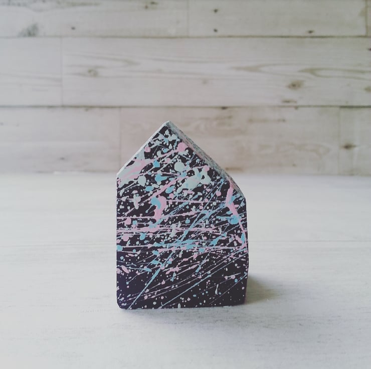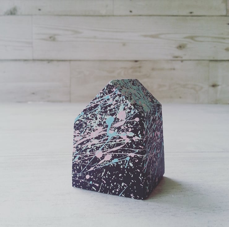 This one of a kind little wooden house is made from reclaimed wood, painted black and splattered, Jackson Pollock style, in mint, pink and pale blue paint.