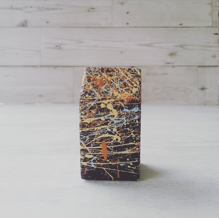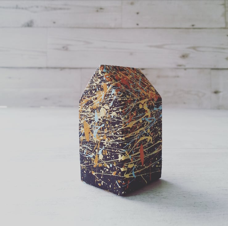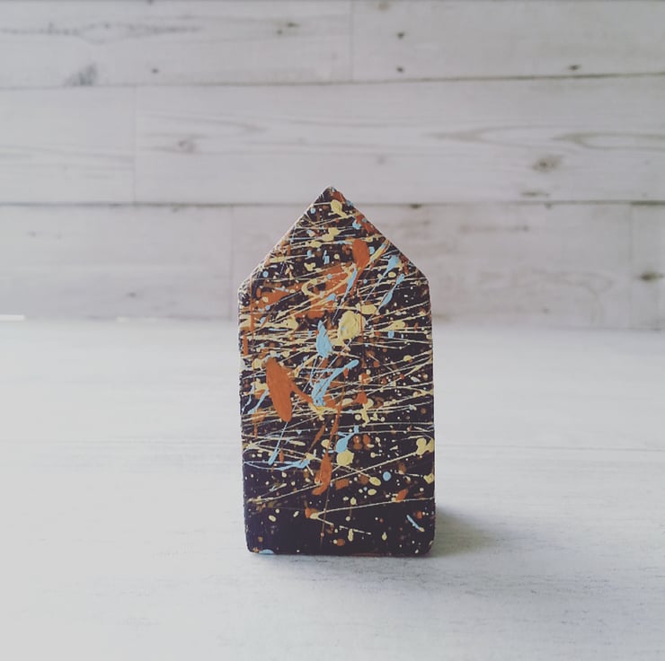 This one of a kind little wooden house is made from reclaimed wood, painted black and splattered, Jackson Pollock style, in yellow, orange and blue paint.