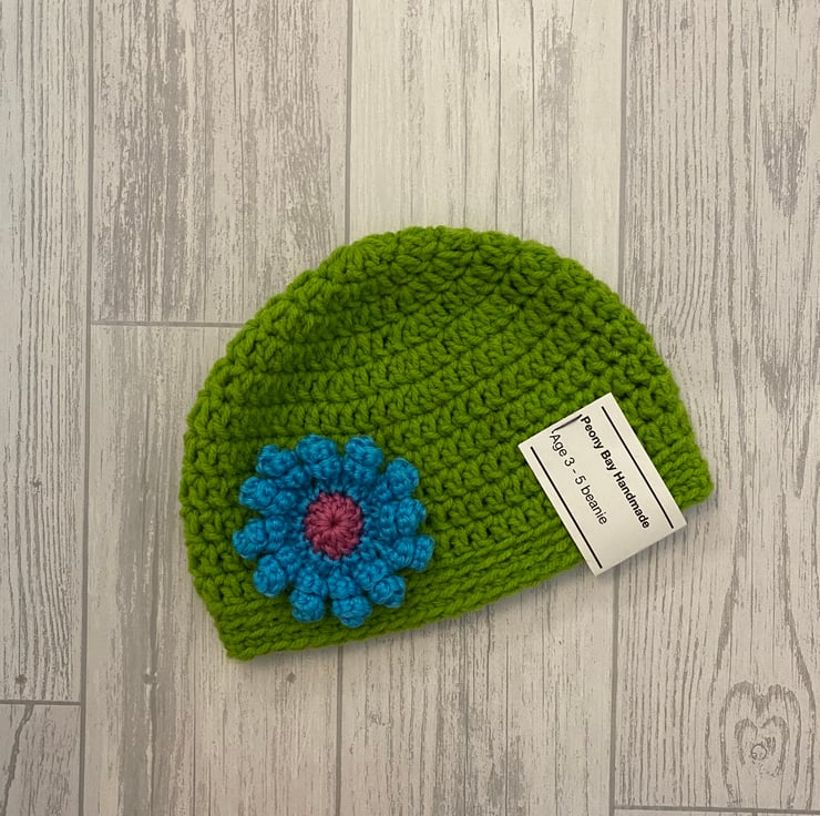I’ve crocheted this beanie hat in green yarn and attached a pretty pink and blue flower with 12 twirly petals. It’s suitable for age 3-5 years.