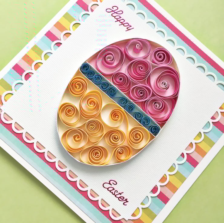 I made this card by selecting two strips of the same colour paper in different shades. I then quilled them together to create two-toned swirls. The egg is on a scalloped ivory mat and has a brightly-coloured striped background. The co-ordinating pink greeting on the front of the card says Happy Easter.