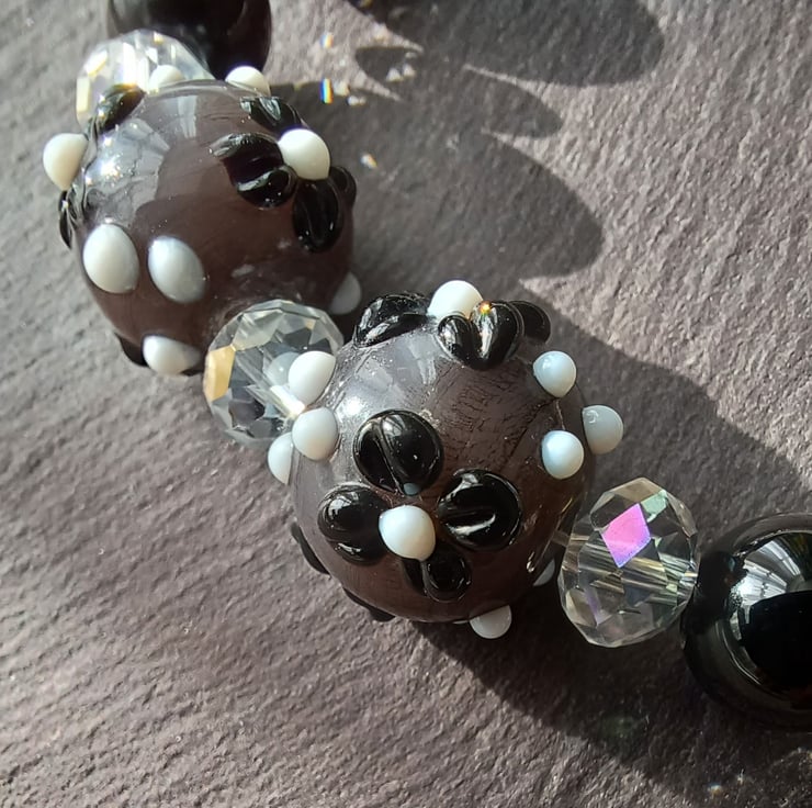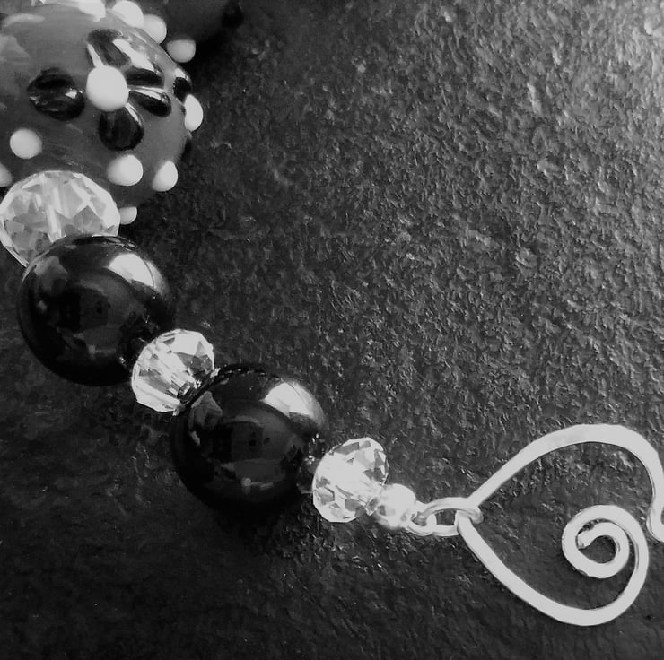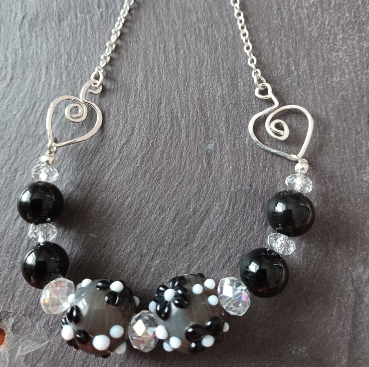 Necklace with 4 x1cm black onyx, and 2 x 1.5cm grey glass flower beads interspersed with clear sparkling swarovski beads. The beads are suspended on a sterling silver chain with fashioned heart ends. The chain is fastened with a handmade T and heart clasp. The necklace is 44cm long