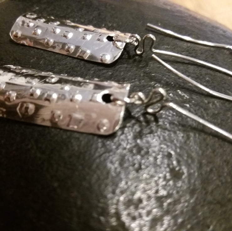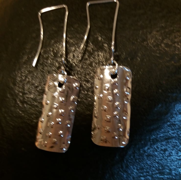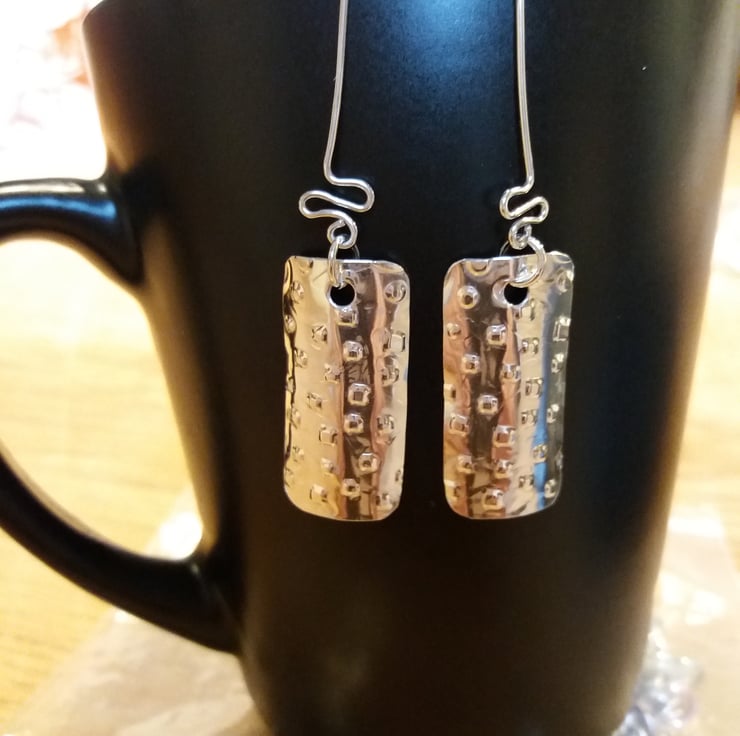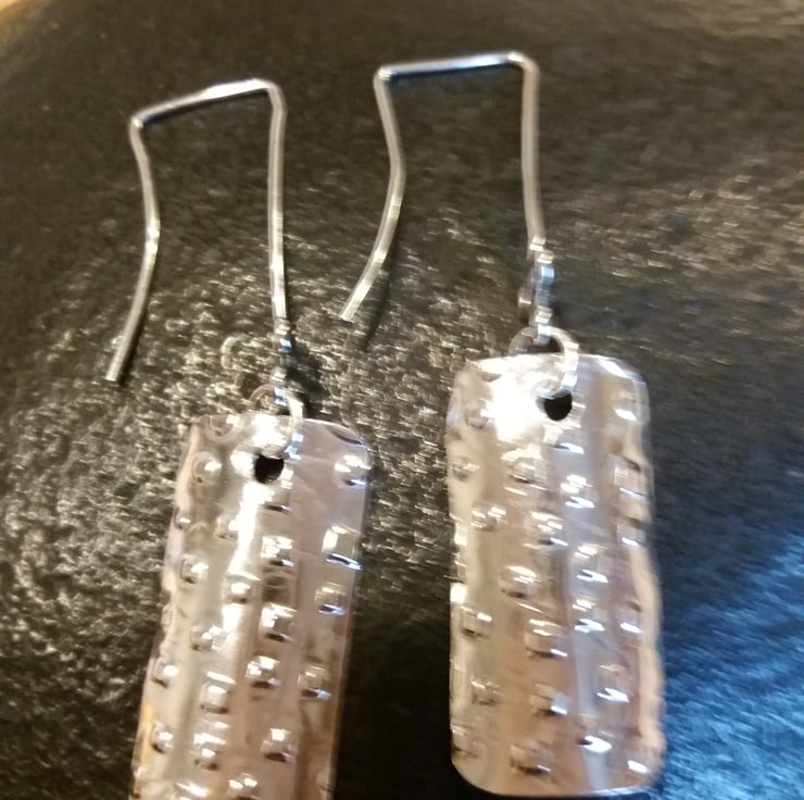 Sterling silver rectangles with embossed bobbles hanging from handmade sterling silver ear wires. The rectangles are 3cm long and 1.4cm wide, The earrings drop 6cm from the top of the earwires.