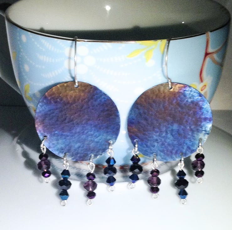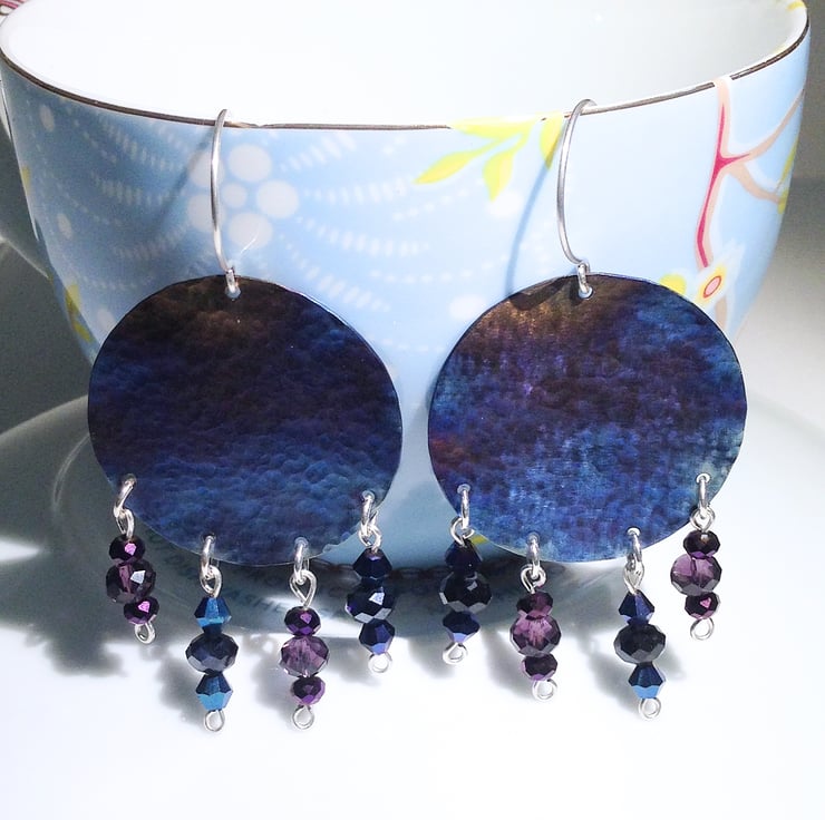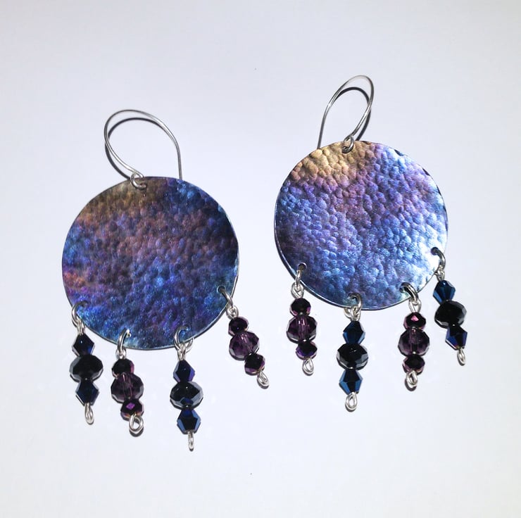I have made these earrings by hand sawing the discs from titanium sheet and then giving the surface an attractive hammered finish to create texture before colouring. I have then created crystal bead drops on sterling silver wire and hung these from the discs..