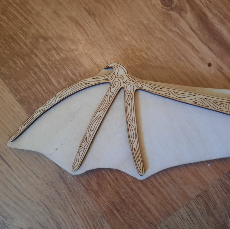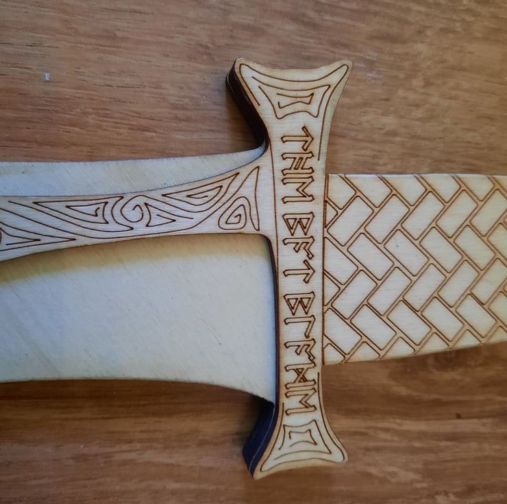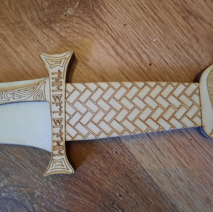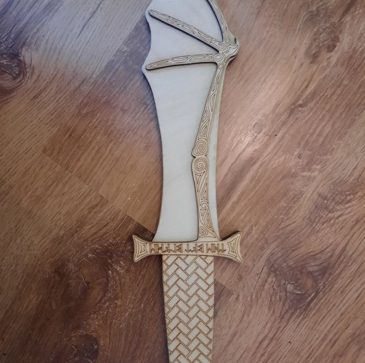 The sword is our very own design, and the layers have been laser cut with our own machine, and the wood locally sourced. It is a goblin bat blade, influenced by fantasy stories. It has bat wing-shaped blade, with wood grain texture in places, a textile herringbone grip, with runes on the hilt-guard and textured pommel. The runes on the hilt guard say 'Bat Blade - Stephen Made Me'.