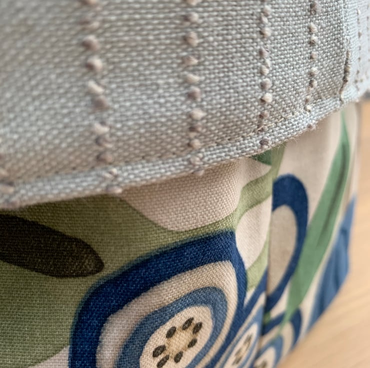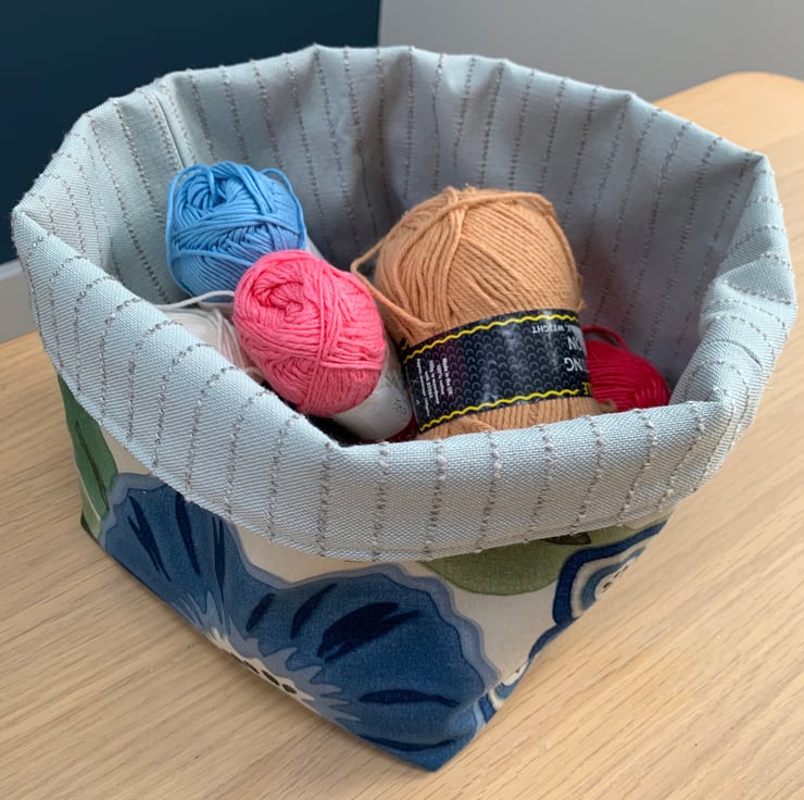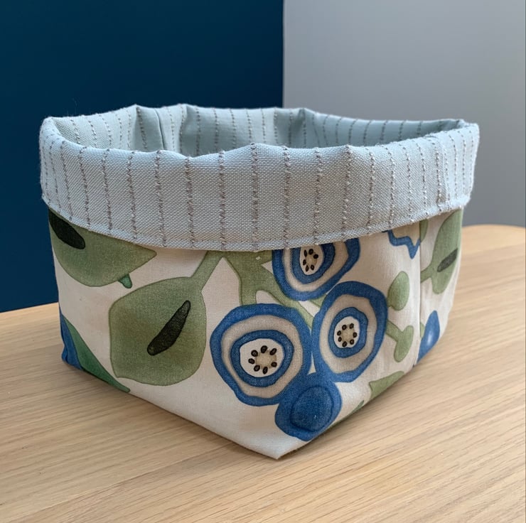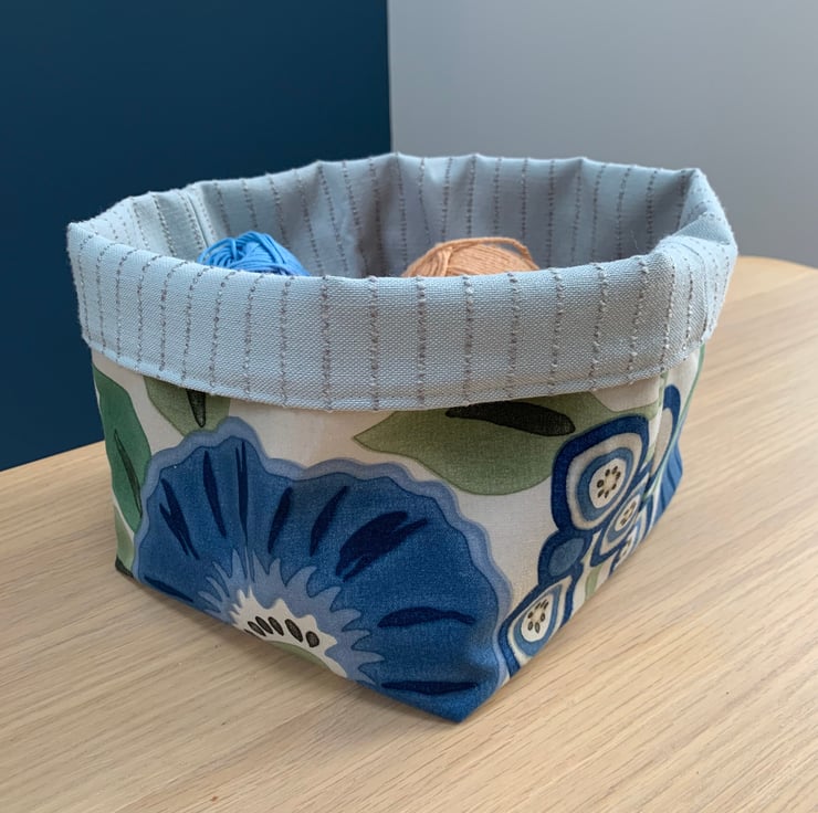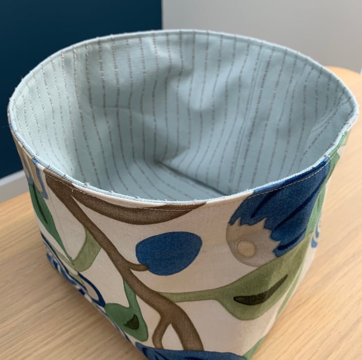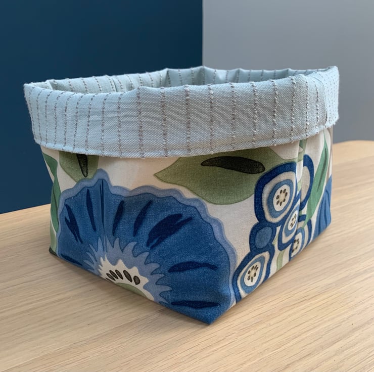 Reversible fabric basket made from beautiful Sanderson Tree Poppy fabric and pale blue fabric with a textured pin-stripe. Can be used with a turn-down to make the most of the contrasting fabrics.