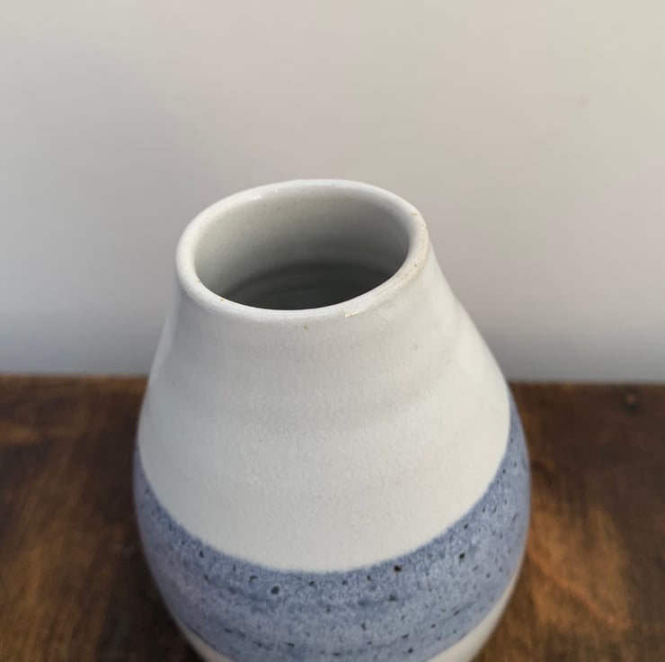 After they have been thrown and trimmed I painted blue slip (liquid clay) in a band around the middle of the vase. The vases are then left to dry completely before their first firing in the kiln. Some of the vases have had their rims manipulated to make them oval shaped.