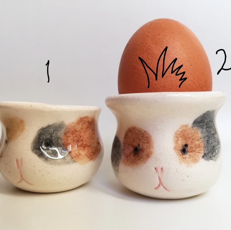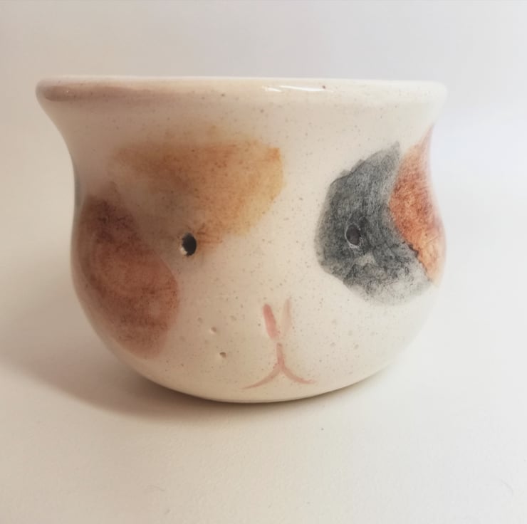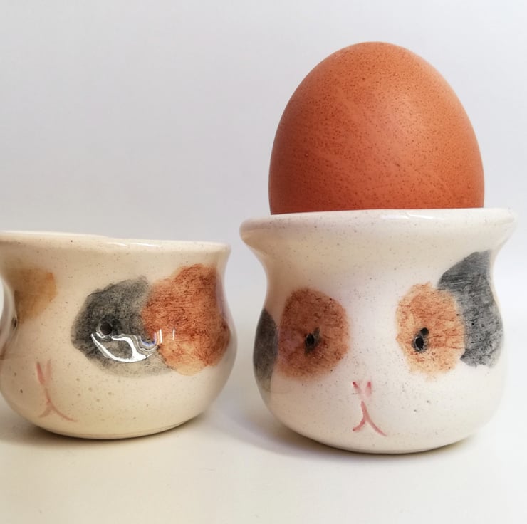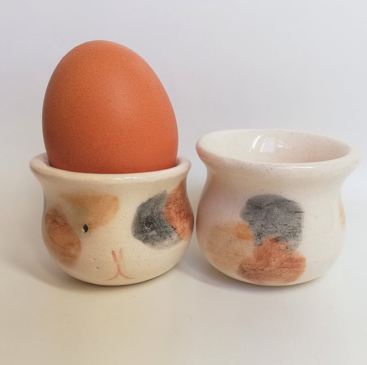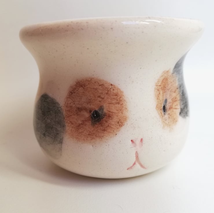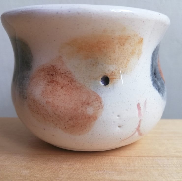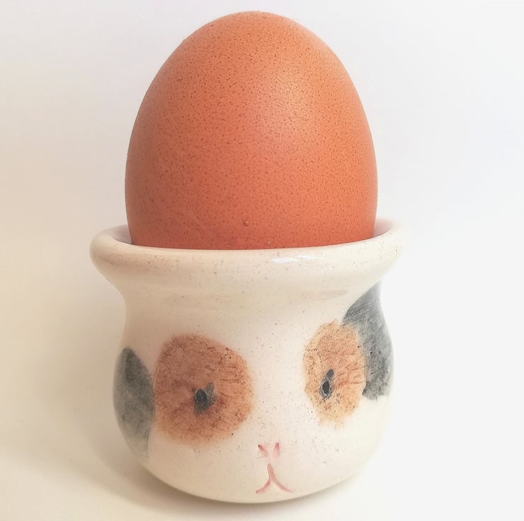 Hand made guinea pig egg cup in off white earthenware clay with handpainted face and colouring.