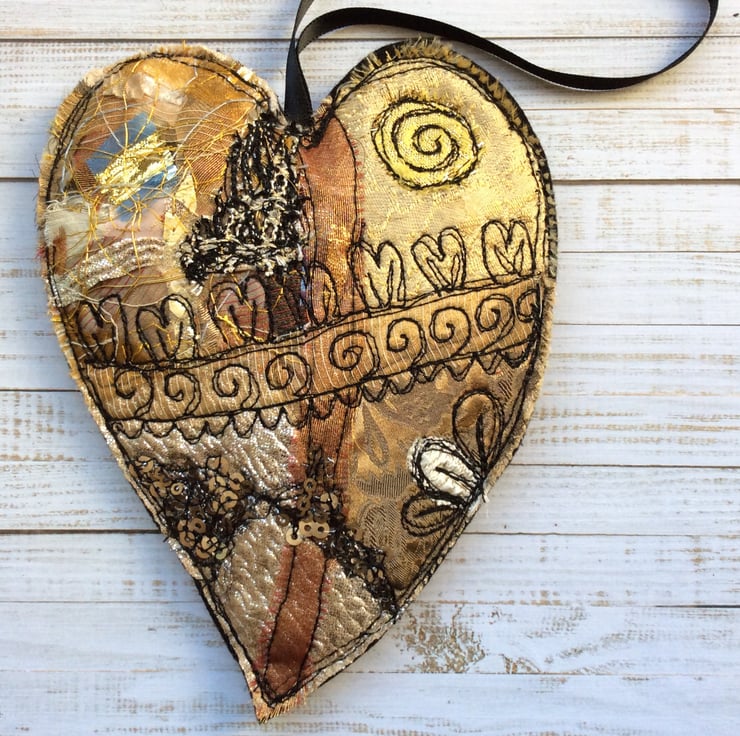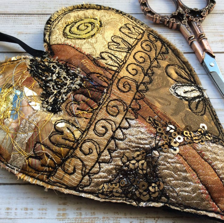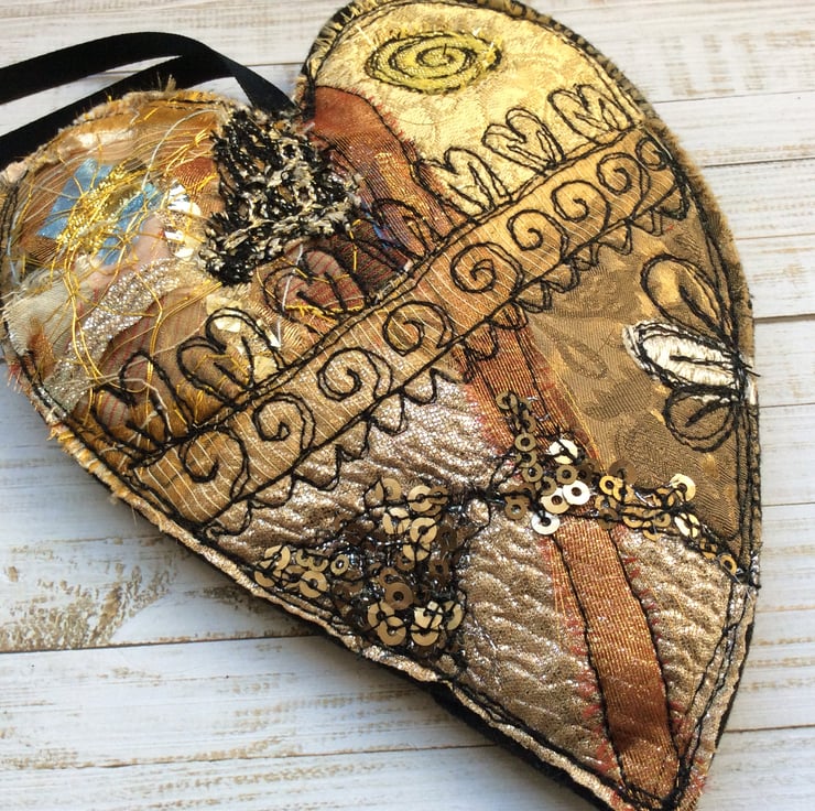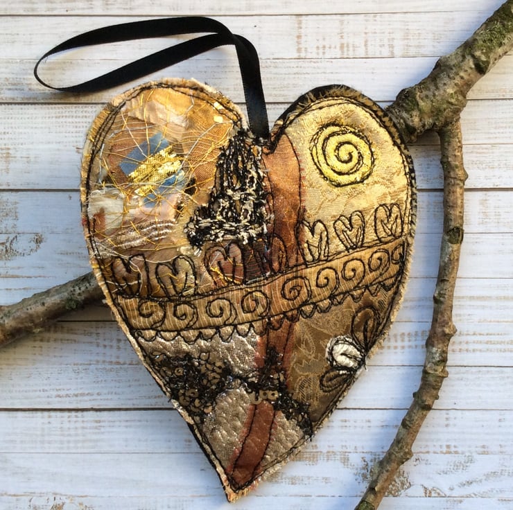 This handmade heart decoration has been enhanced with free motion embroidery. It’s 100% up-cycled fabrics, backing, stuffing and ribbon. The fabric is patchwork with Mendhi patterns drawn on top. It’s felt backed and comes with a matching ribbon. It measures 12cm x 15.5cm approx. With the ribbon the length is 26cm.