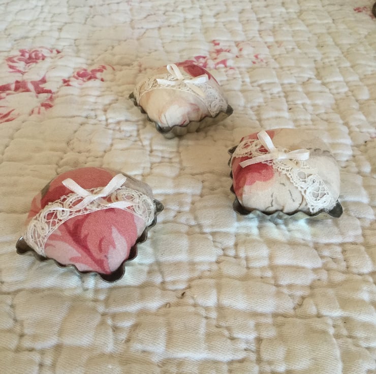 Vintage pin cushion, set in a vintage mini patisserie tin.