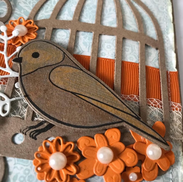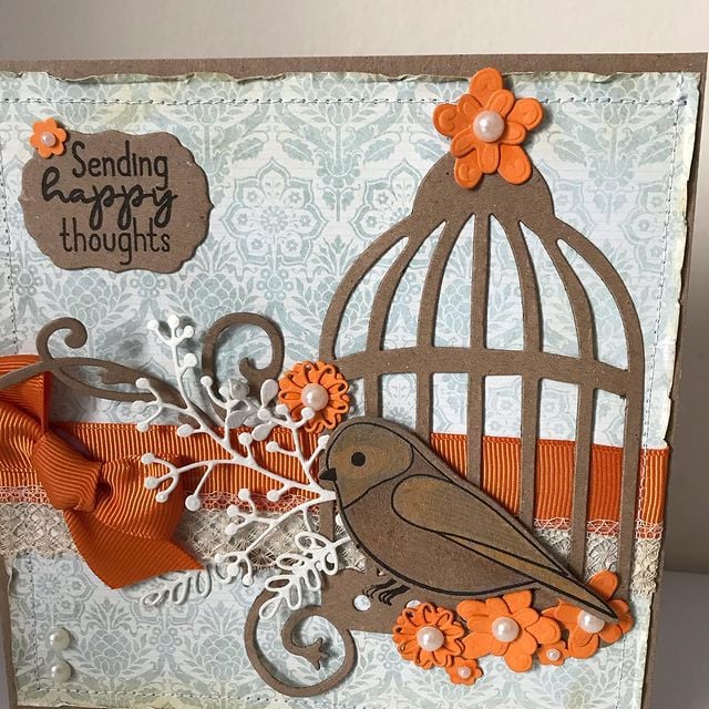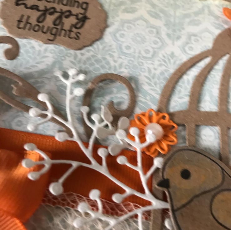 Handcrafted card made using a die cut birdcage, die cut and stamped bird, flowers and leaves also die cut and embellished with pearls, the paper has been machine stitched onto the card, the sentiment on the front reads 'Sending Happy Thoughts', paper insert inside the card is left blank for your own message, or contact me if you would like a message added, (I have stamps for most occasions), supplied with an envelope. card measures 6x6".