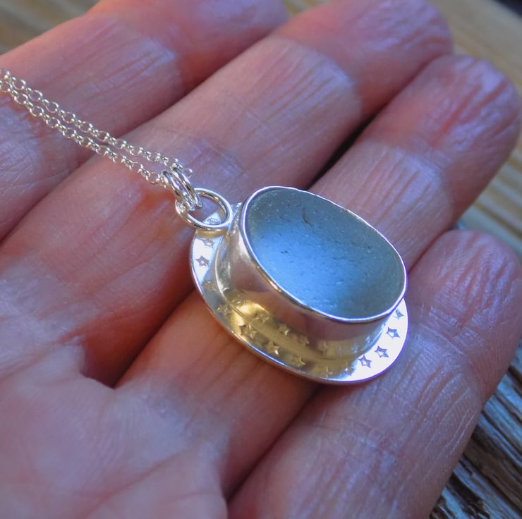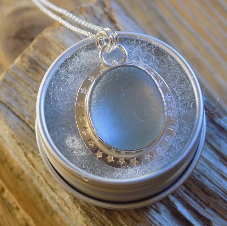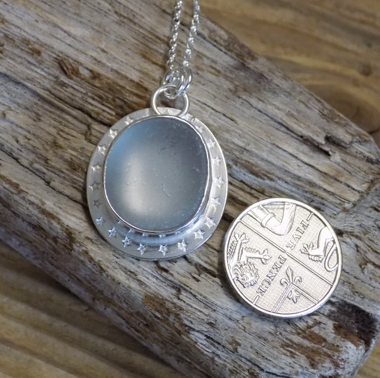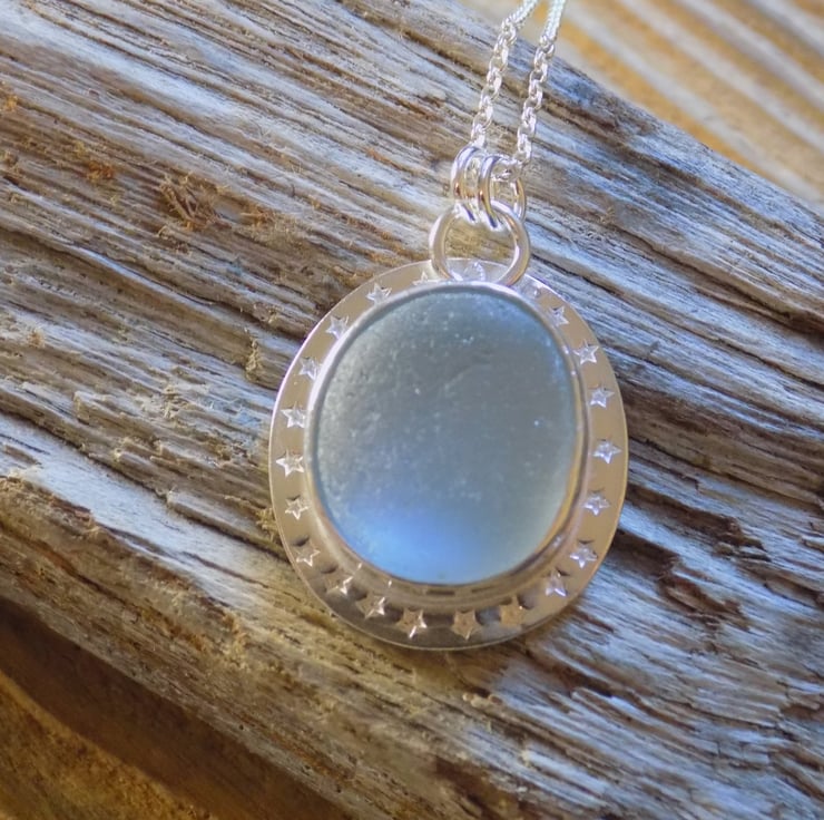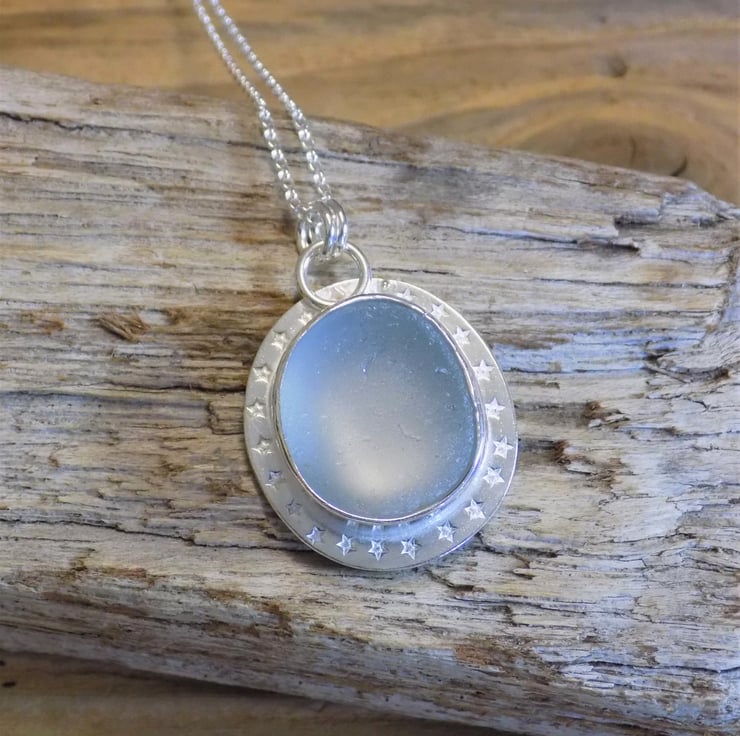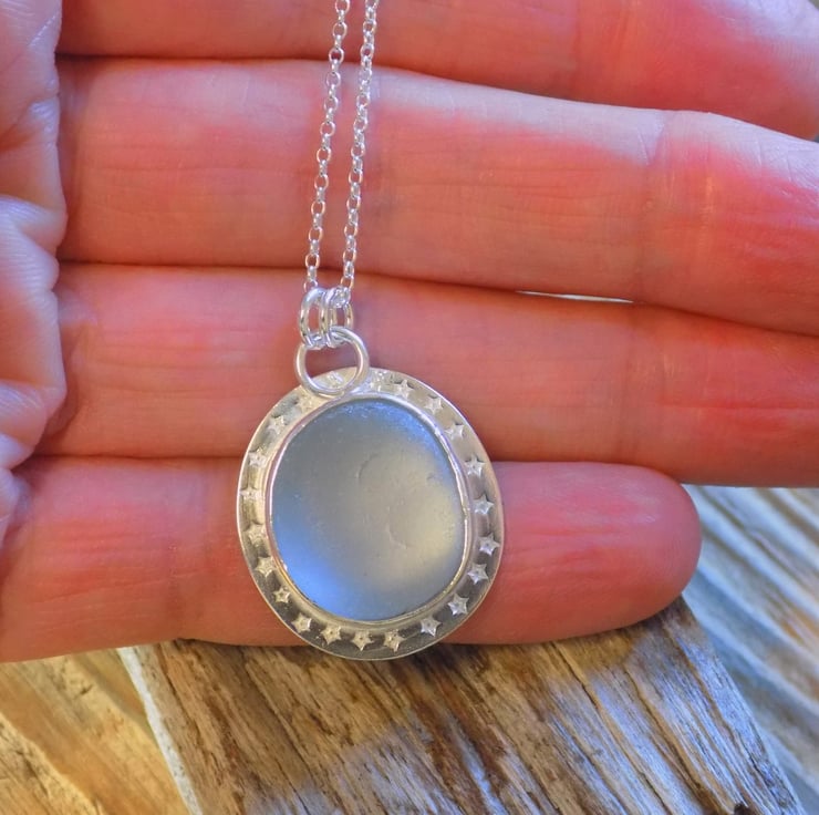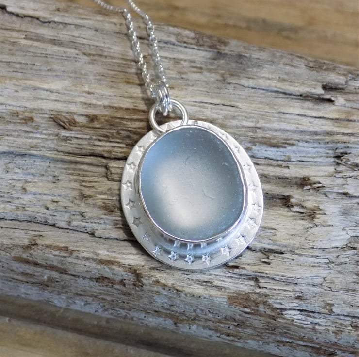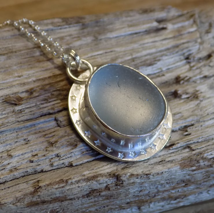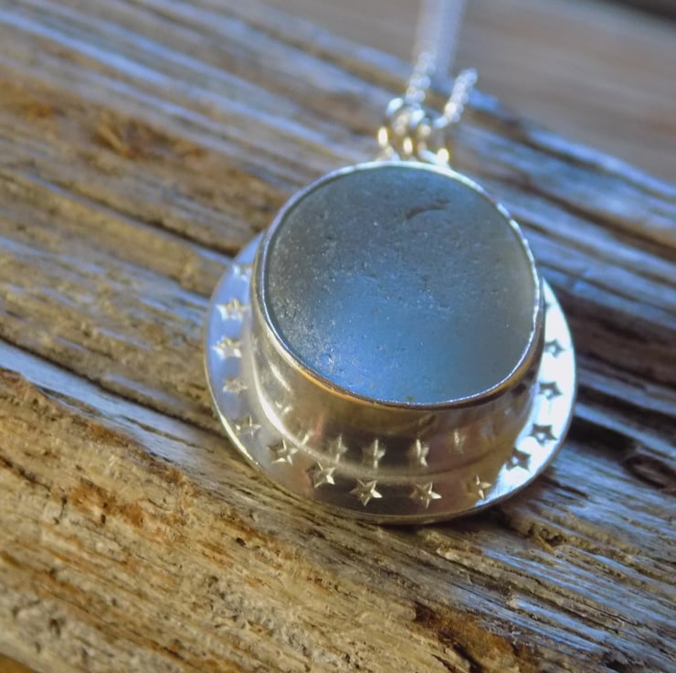 Made from sterling silver sheet using traditional silver smithing techniques. The sea glass has an unusual grey hue and looks almost opalescent set in the silver . A real eye-catching piece adorned with tiny little stars around the edge and hung on a 18" sterling silver belcher chain.