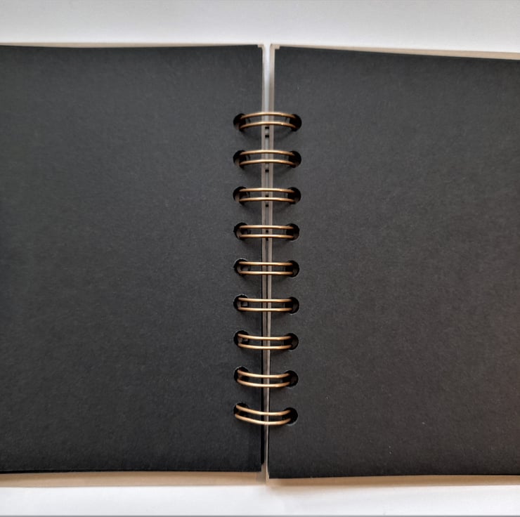 A hand made blank, junk journal / notebook containing beautiful smooth black paper, 120gsm in weight - all neatly bound with a bronze wire and with plain buff card covers. This would be fabulous for creative junk journalling, for you to personalise and embellish. There are 50 sheets of paper / 100 pages/sides. Plain buff coloured card cover.