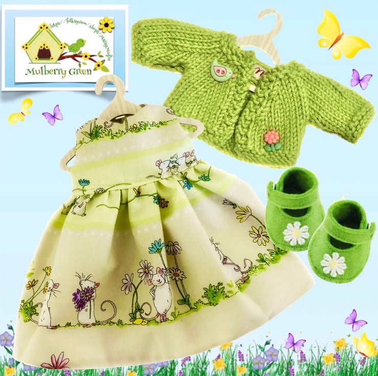 A beautiful little dress in a mice and daisies print, to fit the Mulberry Green characters. The dress has a full skirt, a lined bodice and comes on a cute little wooden hanger.