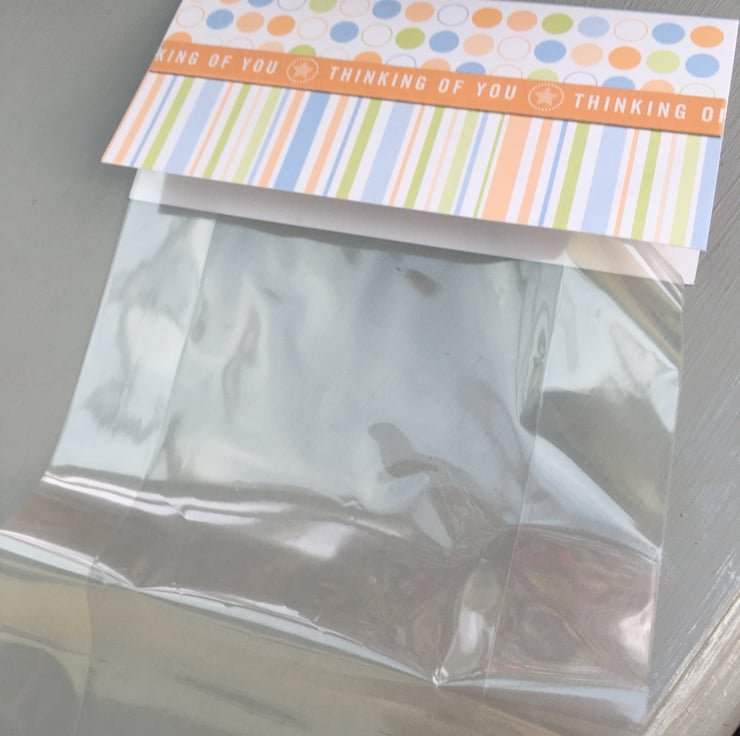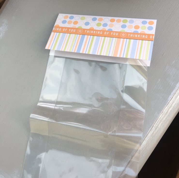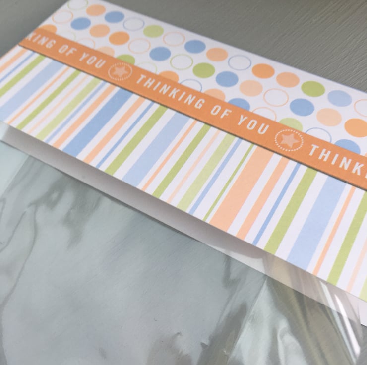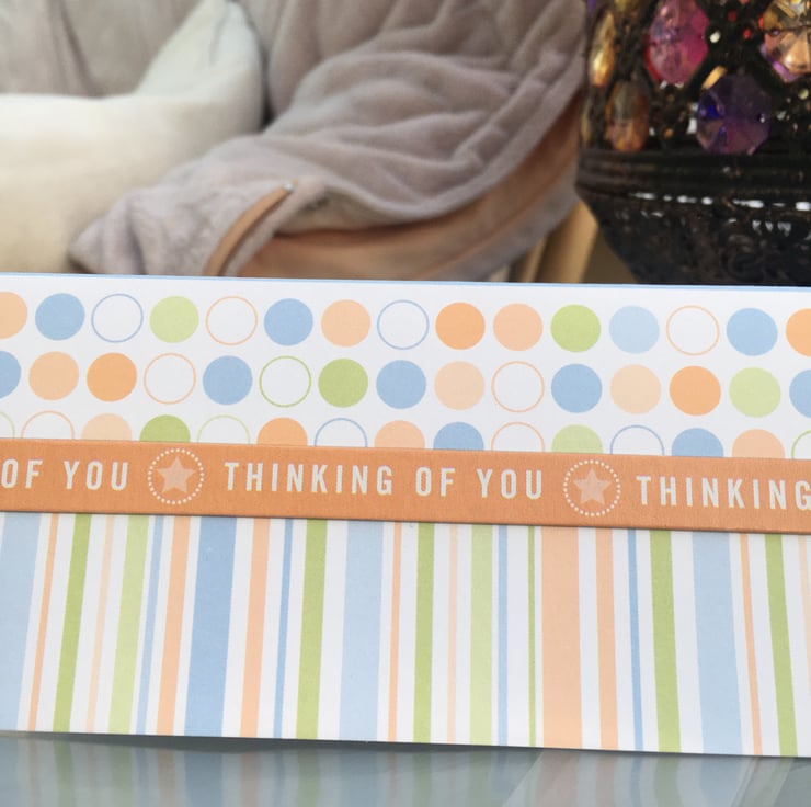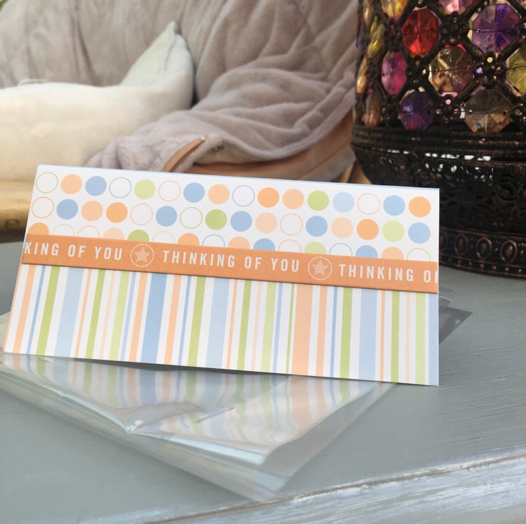 Do you want to cheer someone up? Have you got a thank you gift to send? This gift bag would be a lovely way to send you thoughts to someone special. The bag is 30x13.5cm with gusseted sides, lots of space for a lovely gift. The card top, which can be stapled on once the bag is full, is in pale oranges, blues and green stripes and dots. Across the centre is a banner greeting that says Thinking of you.