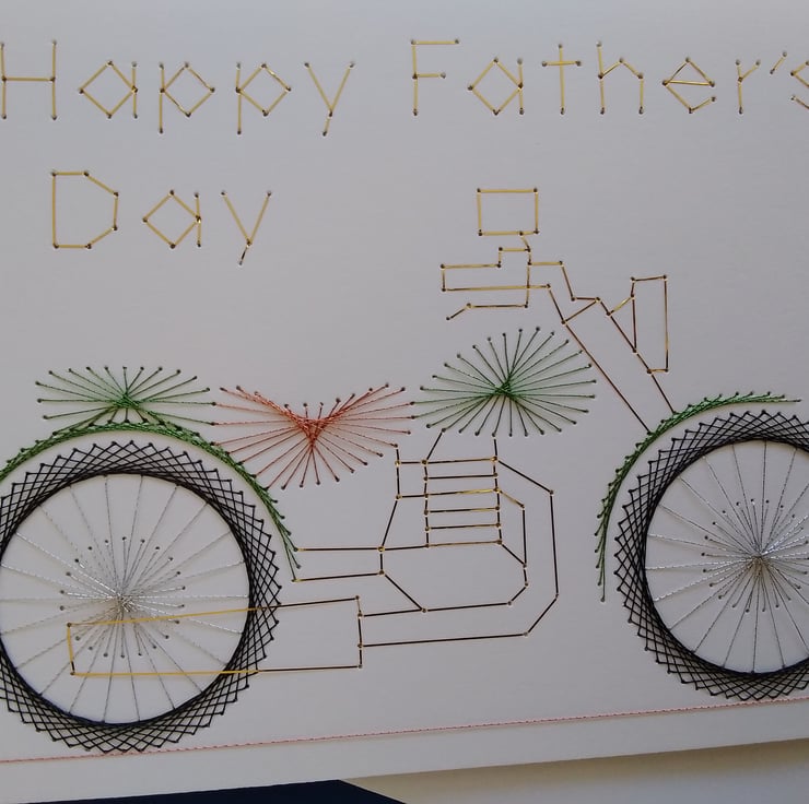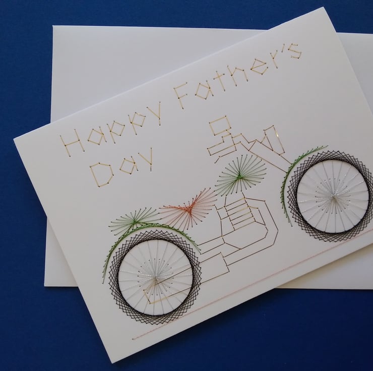 Happy fathers day card featuring a motorbike, hand embroidered in bronze, green, black, gold and silver metallic thread on a white card. The ivory insert has been left blank for your own message.
