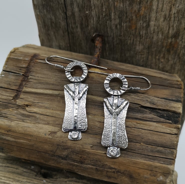 Sterling silver, earrings measure approx 37mm x 11mm excluding the wire hooks (which are also handmade by myself).