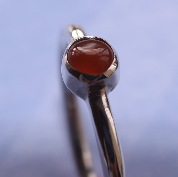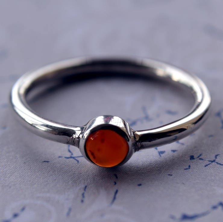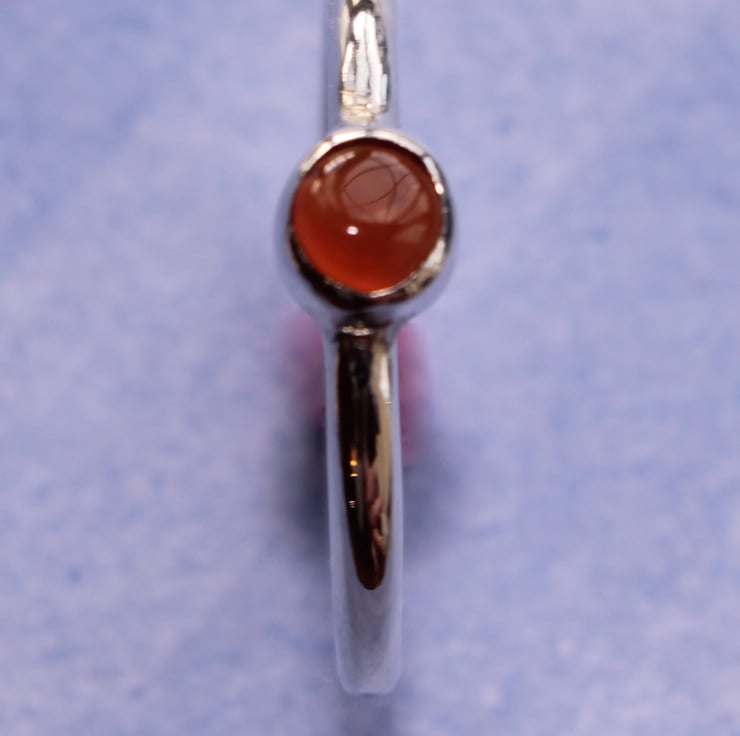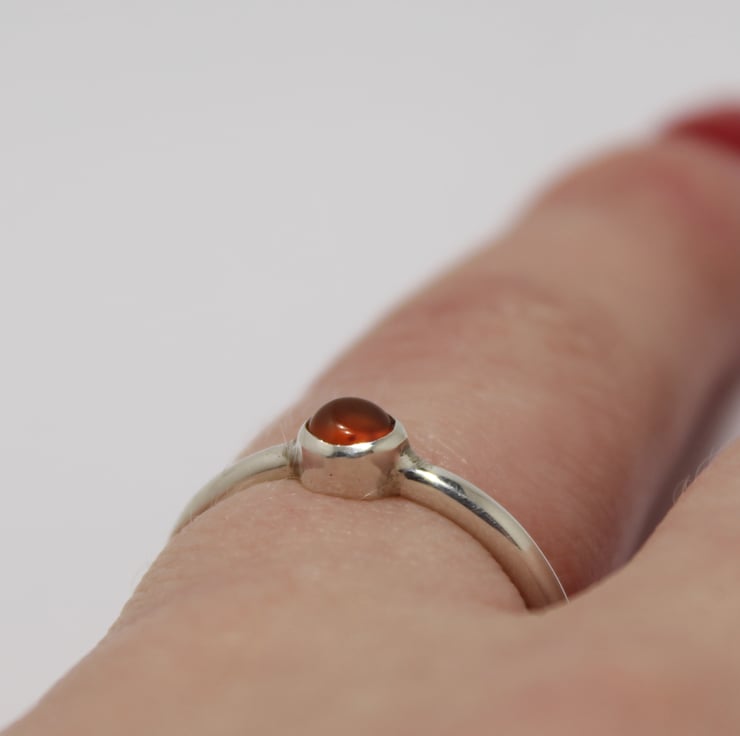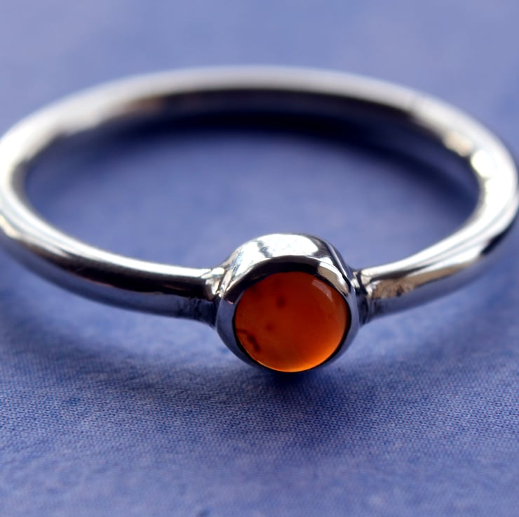 Hand made ring in silver with an orange carnelian tube set gem to add a touch of sparkle and colour. Could be worn singularly or with other dainty rings as a stacker.