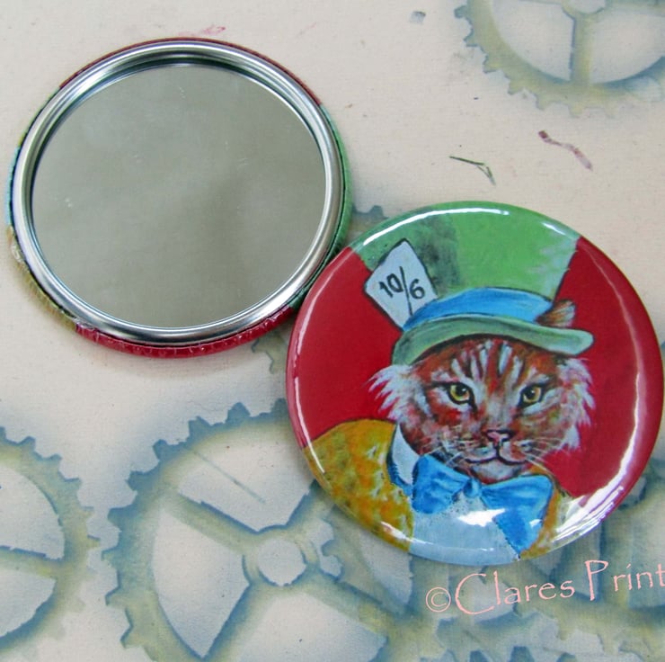 Mad Hatter Cat pocket mirror approx size 58mm (1 included).