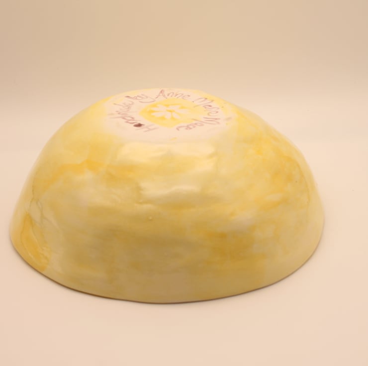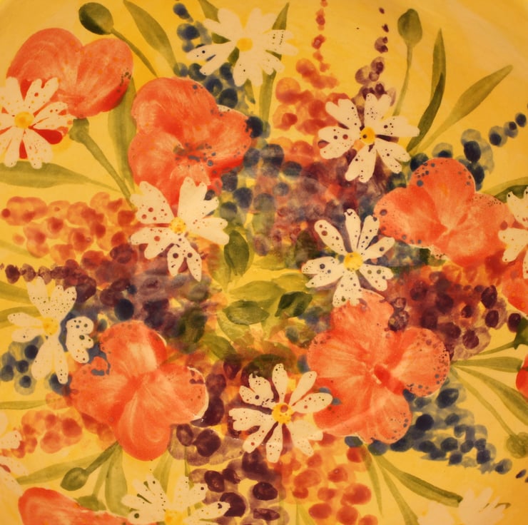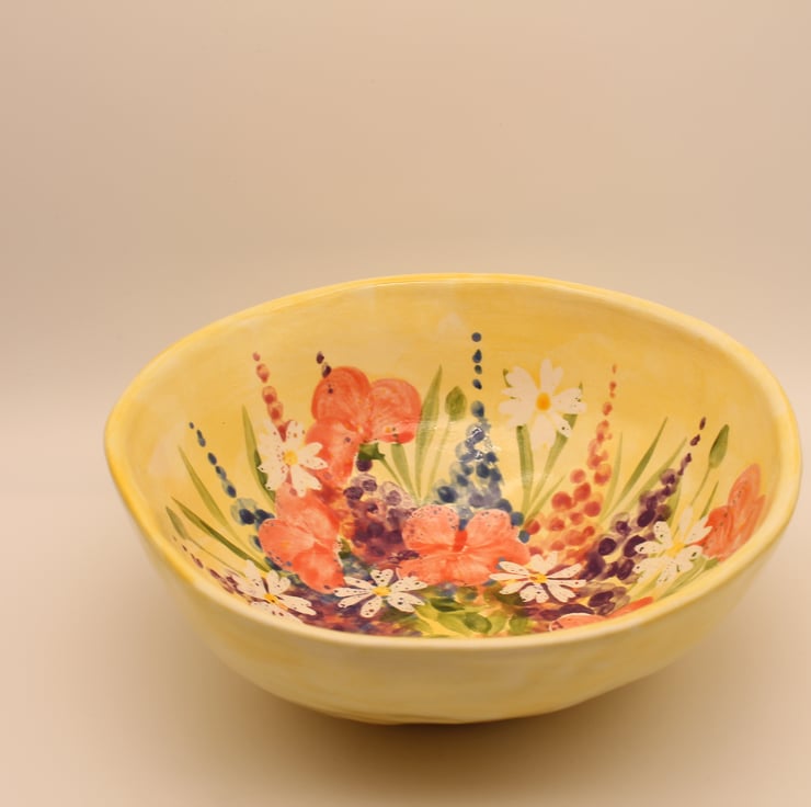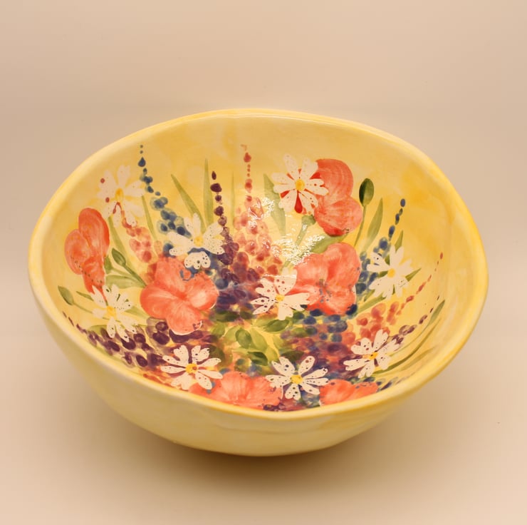 A slip cast bowl from a bowl I made a mould for. Love wobbly bowls! Bisque fired to 1050 C. Hand painted, using brush strokes, with summer flowers , poppies, delphiniums, and daisies. Great as a serving bowl, cereal / soup bowl or just for show.