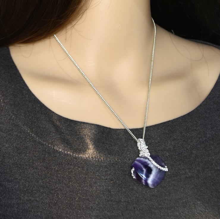 A simple pendant showcasing a beautiful amethyst heart. The 3cm stone is wire wrapped in a 10% silver filled copper wire. The design was finished in a way that it can be worn on either side, making it a dual pendant.
