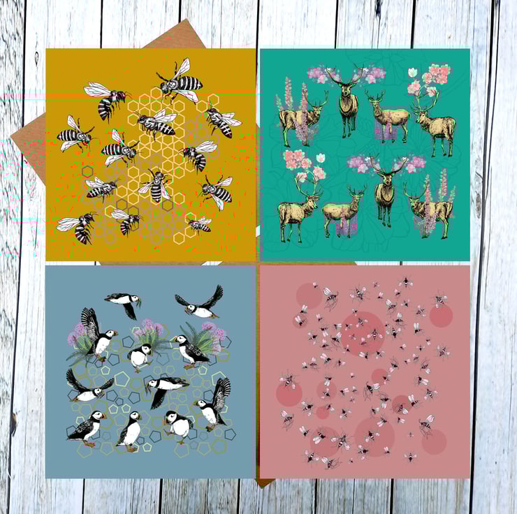 A pack of 4 Scottish animal greetings cards. The greetings cards are brightly coloured and eye catching with hand drawn puffins, midgies, bees and highland deer.