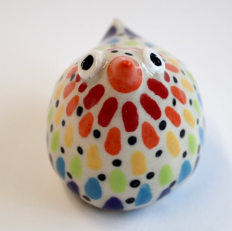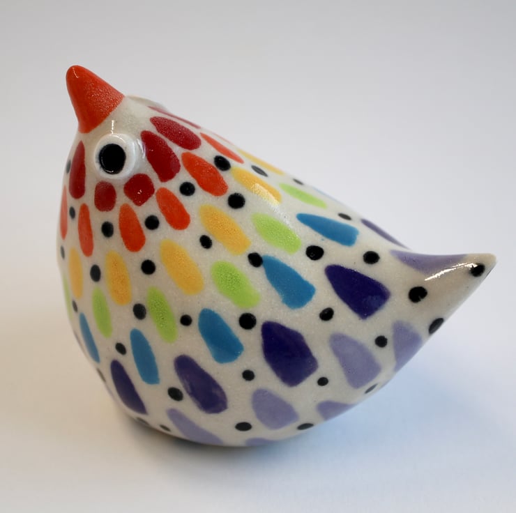 Each little bird is made by hand from white clay and once fashioned it is dried out ready for biscuit firing. After cooking to 950 degrees the bird is painted with underglazes and coated with a clear shiny glaze. A second firing to 1220 degrees completes the process. As each bird is handmade and handpainted they are all slightly different.