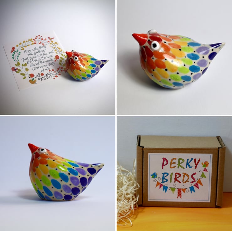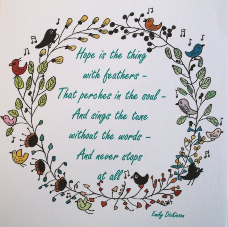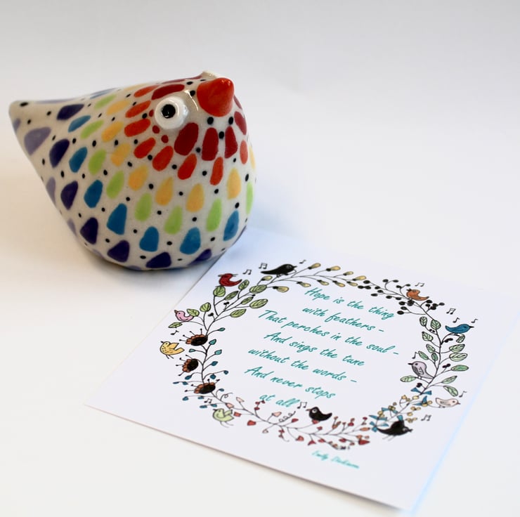 The Rainbow Hope birds come packaged in a straw lined gift box with a copy of a verse from the Emily Dickinson poem ‘Hope is the thing with feathers’ which I have illustrated.