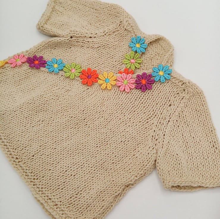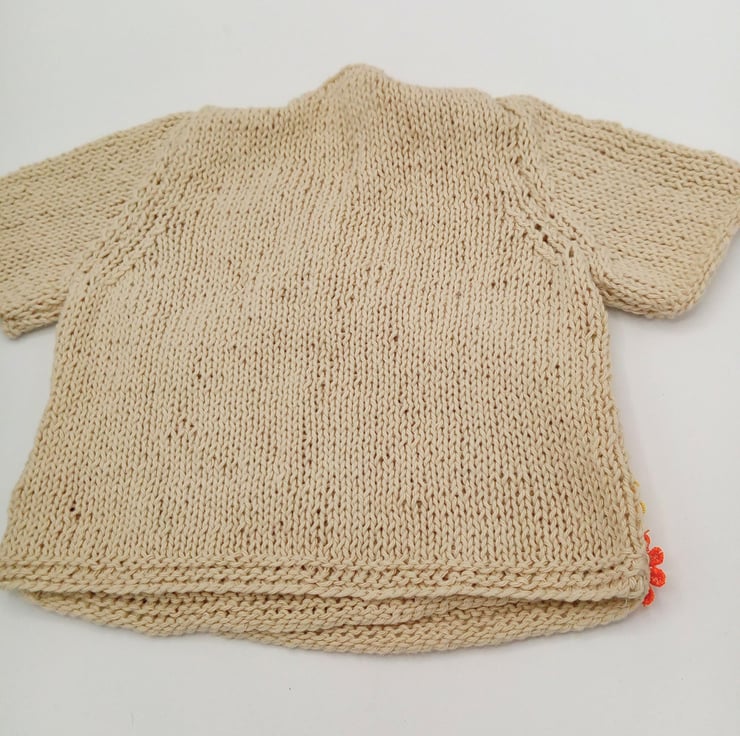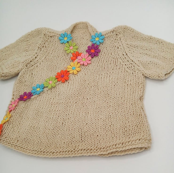 A gorgeous beige crossover T-shirt for a baby with a colourful floral edging at the front around the crossover edges. It is made using a lovely cotton yarn to be soft on baby's delicate skin. It can be worn as a vest under baby's outer clothes or as a summer t-shirt.