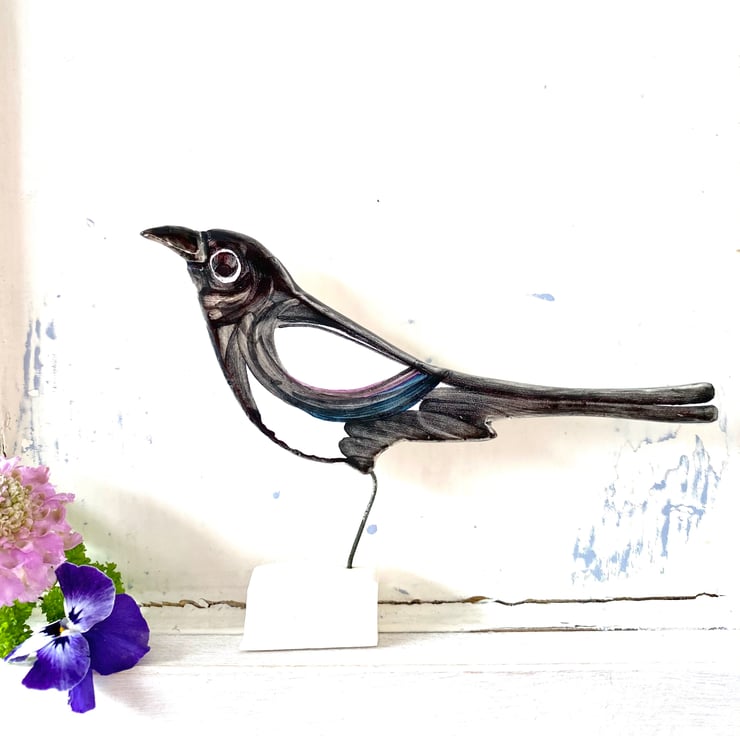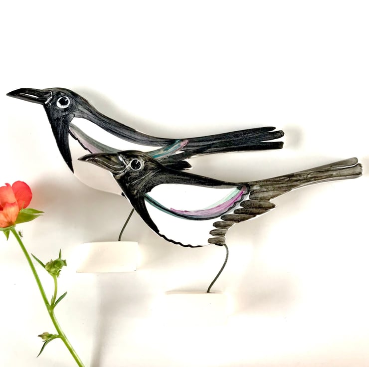 I often watch the magpies, outside the pottery window fighting over the scraps of food that I put out for them each day, they seem to make such a huge amount of noise, and frighten away the smaller birds, but their fabulous, striking plumage, and their cheeky, jaunty mannerisms make them lovable!