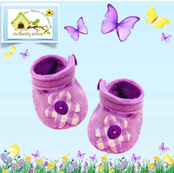 A cute little pair of lavender shoes, decorated with gingham flowers and little buttons to fit the Mulberry Green characters. The shoes are hand stitched using double layers of felt and fasten with a popper underneath a little button.