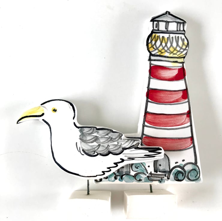 Each piece is one of a kind with a fresh hand-painted cheeky design inspired by my love of the sea and the traditional British seaside. Each one is cut out from a slice of white earthenware clay, mounted on its own ceramic and wire stand, dried, fired in a potter's kiln, then dipped in glaze and ceramic colours to fix the design in the final firing.