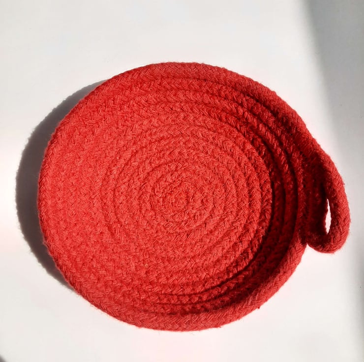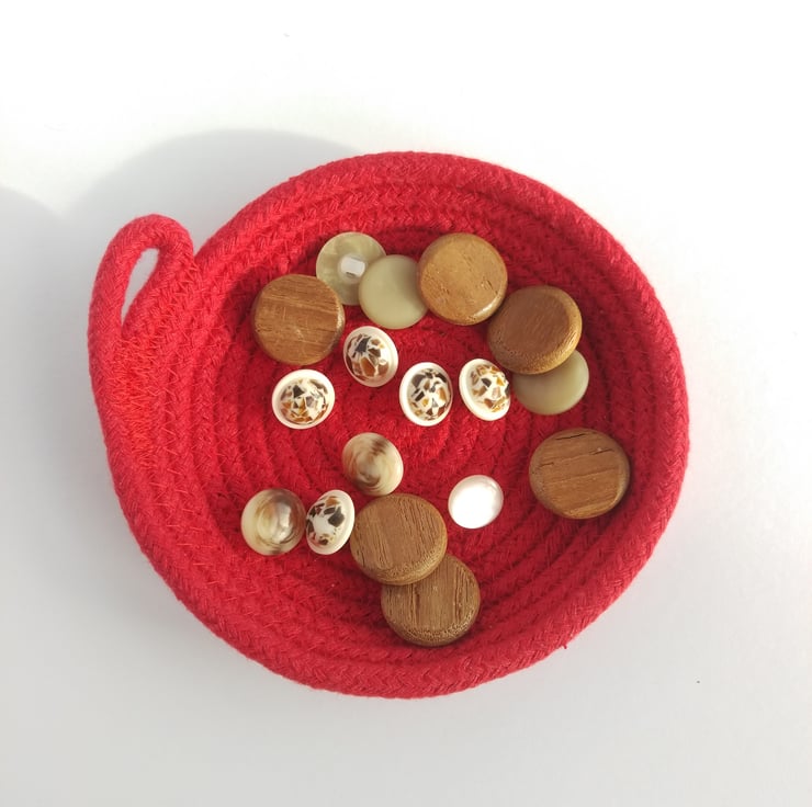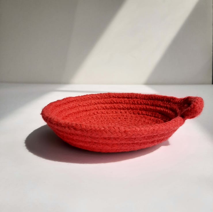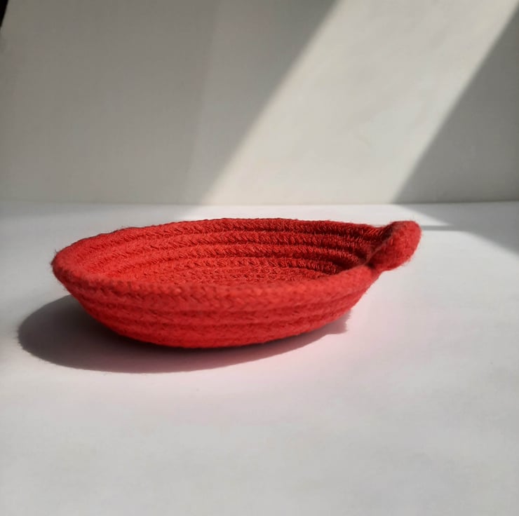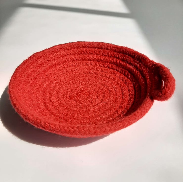 A small coiled rope dish, a little home for your favourite things. This dish is made using 100% cotton rope in a lovely bright red colour, the kind you find in a child's paint set - it's rudolph's nose, fire engines and post boxes.