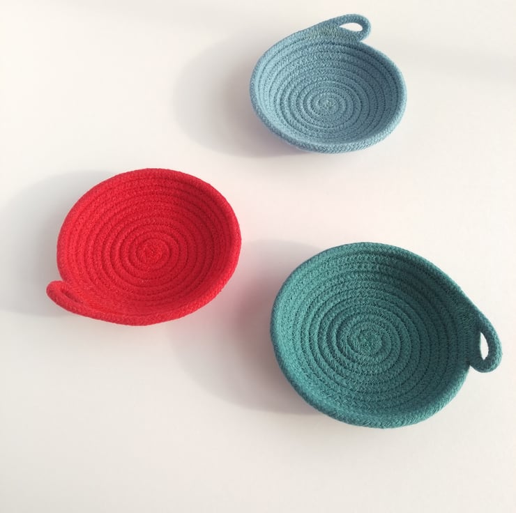 I have designed these little dishes to be a home for life's essentials. Each dish is handmade on my sewing machine from 100% cotton rope. These dishes are around 1" high and 5 - 5 1/2" high. I use a recipe for all of my designs but lots of factors; from the angle I hold the dish at as I form it to slight variations in diameter or softness of rope; can change slightly meaning each dish is unique.
