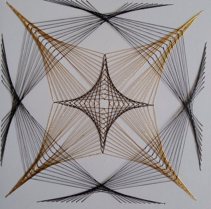 A happy birthday card with a geometric design reminiscent of the old string art. The card has been hand embroidered in black and gold metallic thread on a white card. The gold insert has been left blank for your own message.
